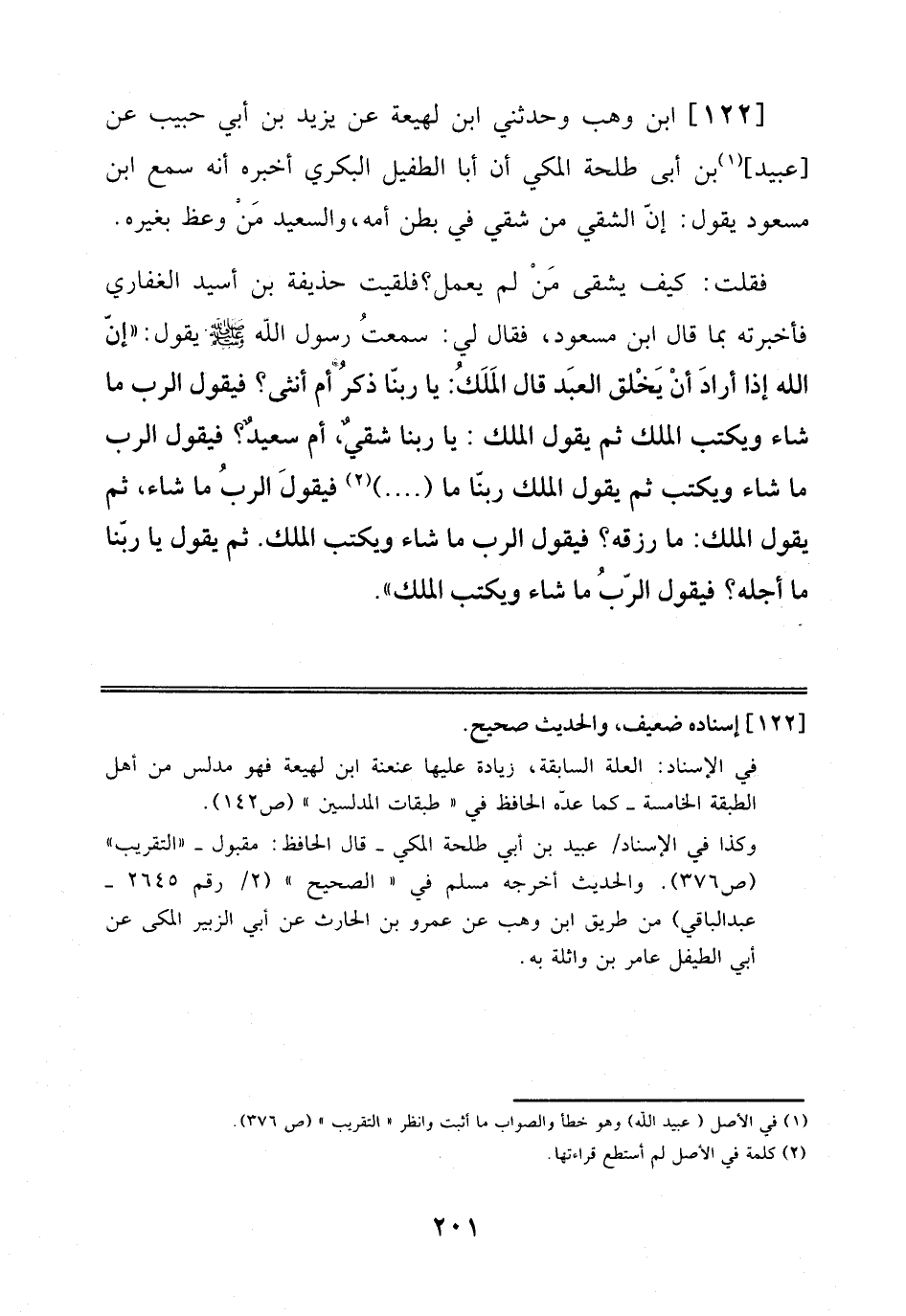 122 - اِبْنُ وَهْبٍ وَحَدَّثَنِي اِبْنُ لَهِيعَةَ عَنْ يَزِيدَ بْنِ أَبِي حَبِيبٍ عَنْ عُبَيْدِ بْنِ أَبِي طَلْحَةَ اَلْمَكِّيِّ أَنَّ أَبَا اَلطُّفَيْلِ اَلْبَكْرِيَّ أَخْبَرَهُ أَنَّهُ سَمِعَ اِبْنَ مَسْعُودٍ يَقُولُ: إِنَّ اَلشَّقِيَّ مَنْ شَقِيَ فِي بَطْنِ أُمِّهِ، وَالسَّعِيدَ مَنْ وُعِظَ بِغَيْرِهِ.