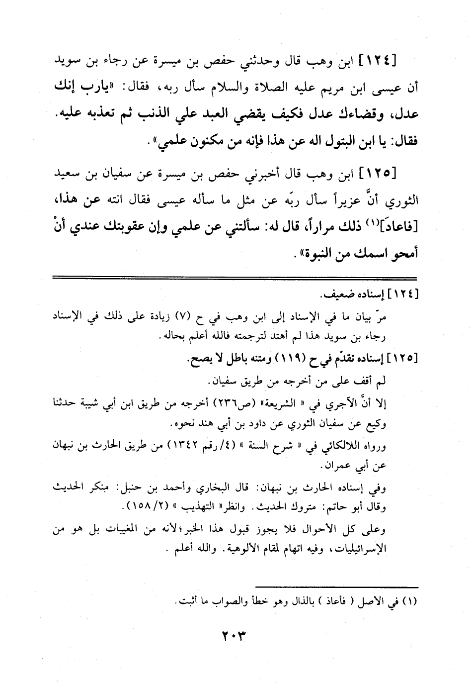 124 - اِبْنُ وَهْبٍ قَالَ: وَحَدَّثَنِي حَفْصُ بْنُ مَيْسَرَةَ عَنْ رَجَاءِ بْنِ سُوَيْدٍ أَنَّ عِيسَى اِبْنَ مَرْيَمَ عَلَيْهِ اَلصَّلَاةُ وَالسَّلَامُ سَأَلَ رَبَّهُ فَقَالَ: "يَا رَبِّ إِنَّكَ عَدْلٌ، وَقَضَاؤُك عَدْلٌ فَكَيْفَ يَقْضِي اَلْعَبْدُ عَلَى اَلذَّنْبِ ثُمَّ تُعَذِّبُهُ عَلَيْهِ? فَقَالَ: يَا اِبْنَ اَلْبَتُولِ إِلْهَ عَنْ هَذَا فَإِنَّهُ مِنْ مَكْنُونِ عِلْمِي".