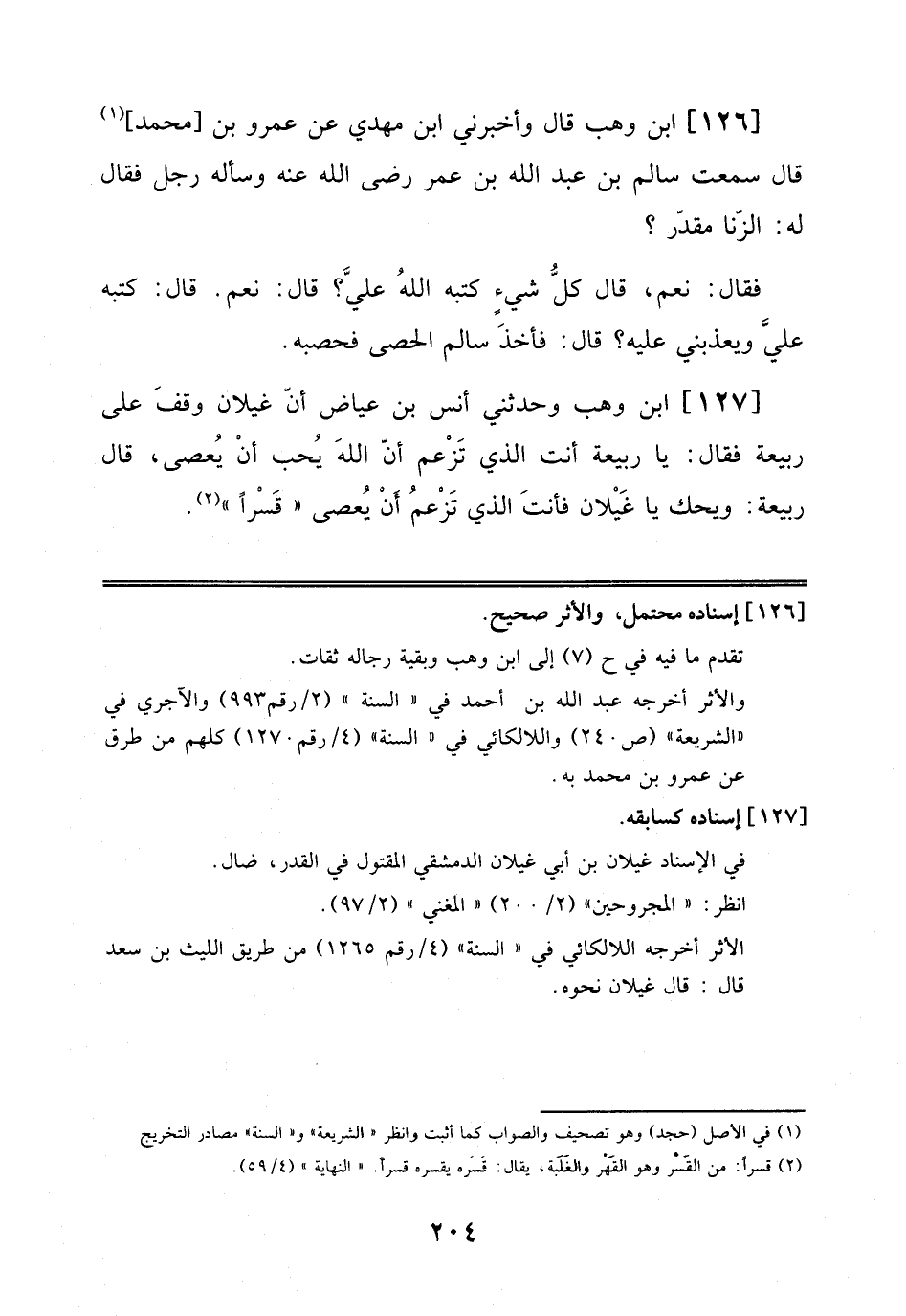 126 - اِبْنُ وَهْبٍ قَالَ: وَأَخْبَرَنِي اِبْنُ مَهْدِيٍّ عَنْ عَمْرِو بْنِ مُحَمَّدٍ قَالَ: سَمِعْتُ سَالِمَ بْنَ عَبْد اللهِ بْنِ عُمَرَ رَضِيَ اَللَّهُ عَنْهُ وَسَأَلَهُ رَجُلٌ فَقَالَ لَهُ: اَلزِّنَا مُقَدَّرٌ?