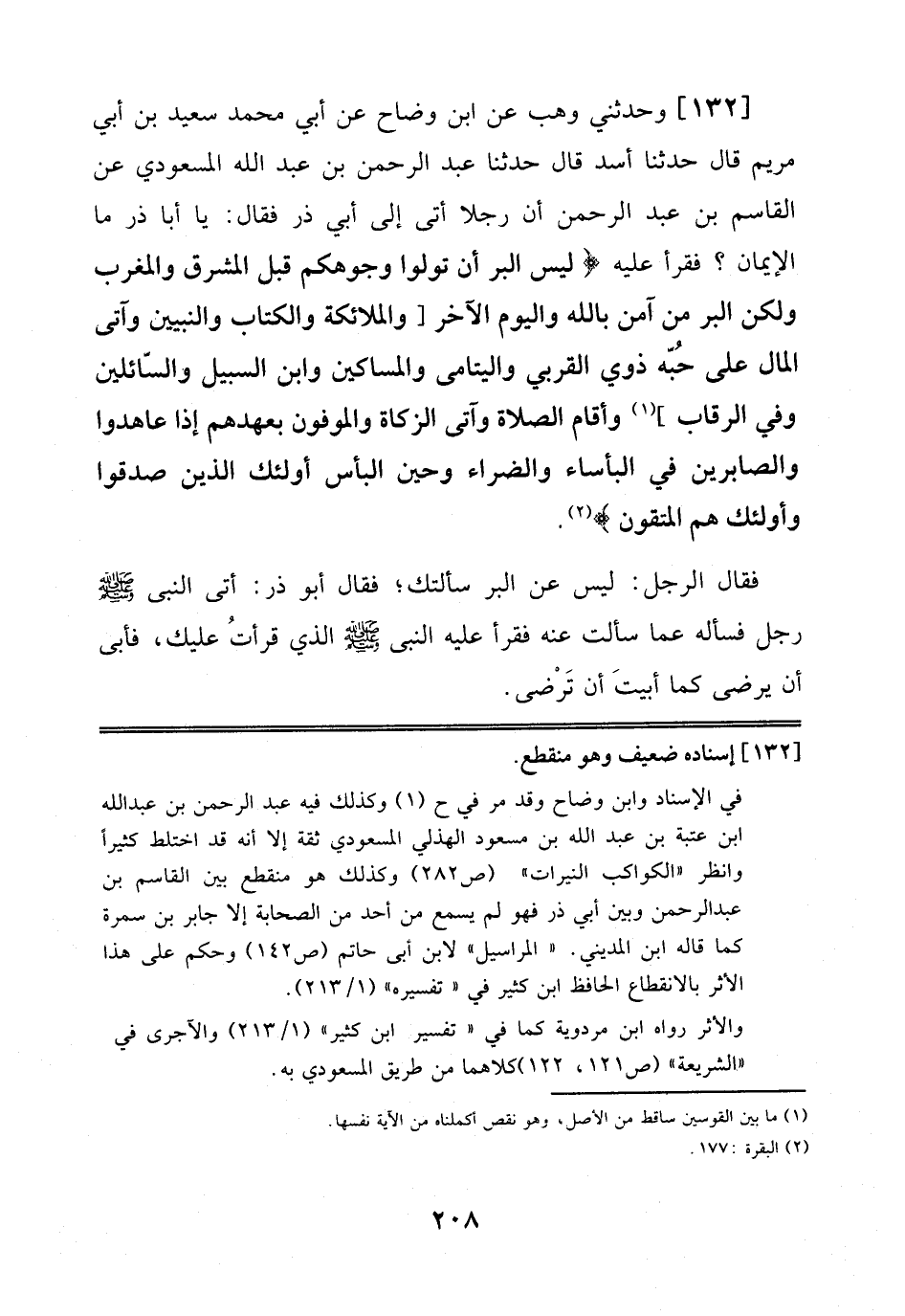 132 - وَحَدَّثَنِي وَهْبٌ عَنْ اِبْنِ وَضَّاحٍ عَنْ أَبِي مُحَمَّدٍ سَعِيدِ بْنِ أَبِي مَرْيَمَ قَالَ: حَدَّثَنَا أَسَدٌ قَالَ: حَدَّثَنَا عَبْد الرَّحْمَنِ بْنُ عَبْد اللهِ اَلْمَسْعُودِيُّ عَنْ اَلْقَاسِمِ بْنِ عَبْد الرَّحْمَن أَنَّ رَجُلًا أَتَى إِلَى أَبِي ذَرٍّ فَقَالَ: يَا أَبَا ذَرٍّ مَا اَلْإِيمَانُ? فَقَرَأَ عَلَيْهِ لَيْسَ اَلْبِرَّ أَنْ تُوَلُّوا وُجُوهَكُمْ قِبَلَ اَلْمَشْرِقِ وَالْمَغْرِبِ وَلَكِنَّ اَلْبِرَّ مَنْ آمَنَ بِاَللَّهِ وَالْيَوْمِ اَلْآخِرِ وَالْمَلَائِكَةِ وَالْكِتَابِ وَالنَّبِيِّينَ وَآتَى اَلْمَالَ عَلَى حُبِّهِ ذَوِي اَلْقُرْبَى وَالْيَتَامَى وَالْمَسَاكِينَ وَابْنَ اَلسَّبِيلِ وَالسَّائِلِينَ وَفِي اَلرِّقَابِ وَأَقَامَ اَلصَّلَاةَ وَآتَى اَلزَّكَاةَ وَالْمُوفُونَ بِعَهْدِهِمْ إِذَا عَاهَدُوا وَالصَّابِرِينَ فِي اَلْبَأْسَاءِ وَالضَّرَّاءِ وَحِينَ اَلْبَأْسِ أُولَئِكَ اَلَّذِينَ صَدَقُوا وَأُولَئِكَ هُمُ اَلْمُتَّقُونَ