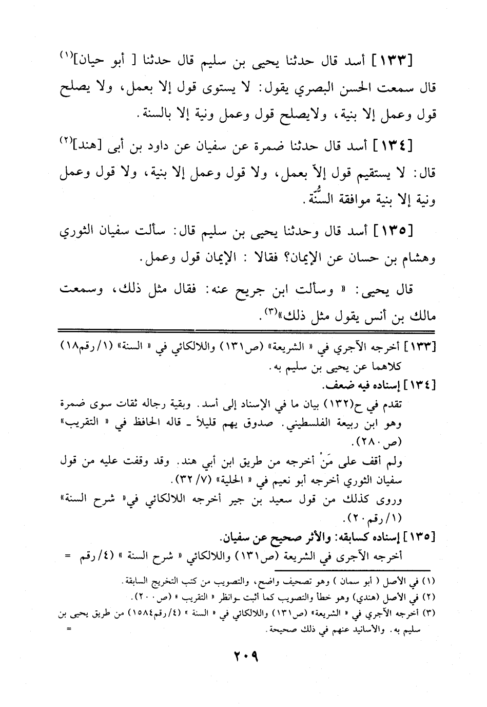 135 - أَسَدٌ قَالَ: وَحَدَّثَنَا يَحْيَى بْنُ سُلَيْمٍ قَالَ: سَأَلْتُ سُفْيَانَ اَلثَّوْرِيَّ وَهِشَامَ بْنَ حَسَّانٍ عَنْ اَلْإِيمَانِ? فَقَالَا: اَلْإِيمَانُ قَوْلٌ وَعَمَلٌ.