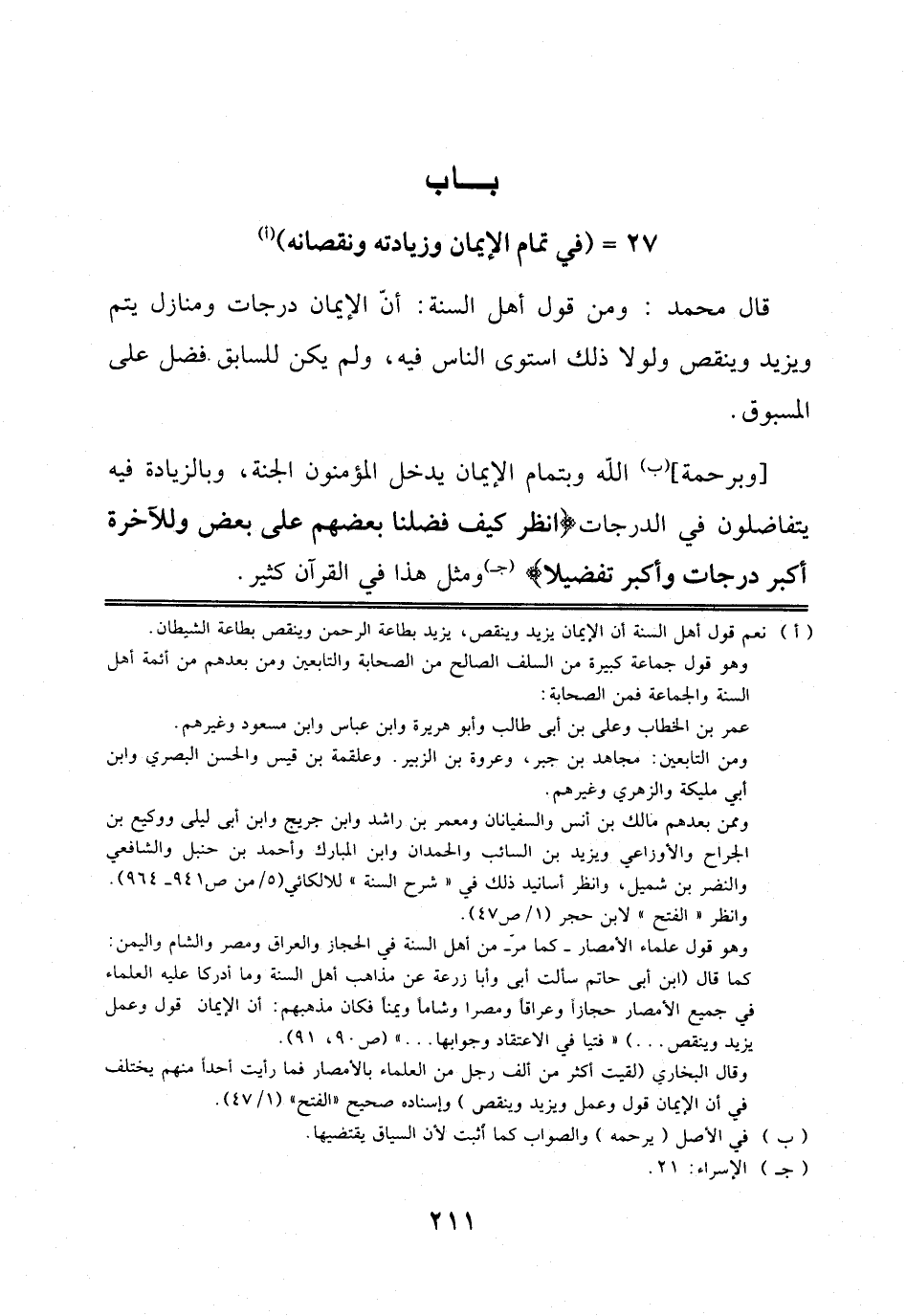 قَالَ مُحَمَّدٌ: وَمِنْ قَوْلِ أَهْلِ اَلسُّنَّةِ: إِنَّ اَلْإِيمَانَ دَرَجَاتٌ وَمَنَازِلُ يَتِمُّ وَيَزِيدُ وَيَنْقُصُ وَلَوْلَا ذَلِكَ اِسْتَوَى فِيهِ اَلنَّاسُ، وَلَمْ يَكُنْ لِلسَّابِقِ فَضْلٌ عَلَى اَلْمَسْبُوقِ.