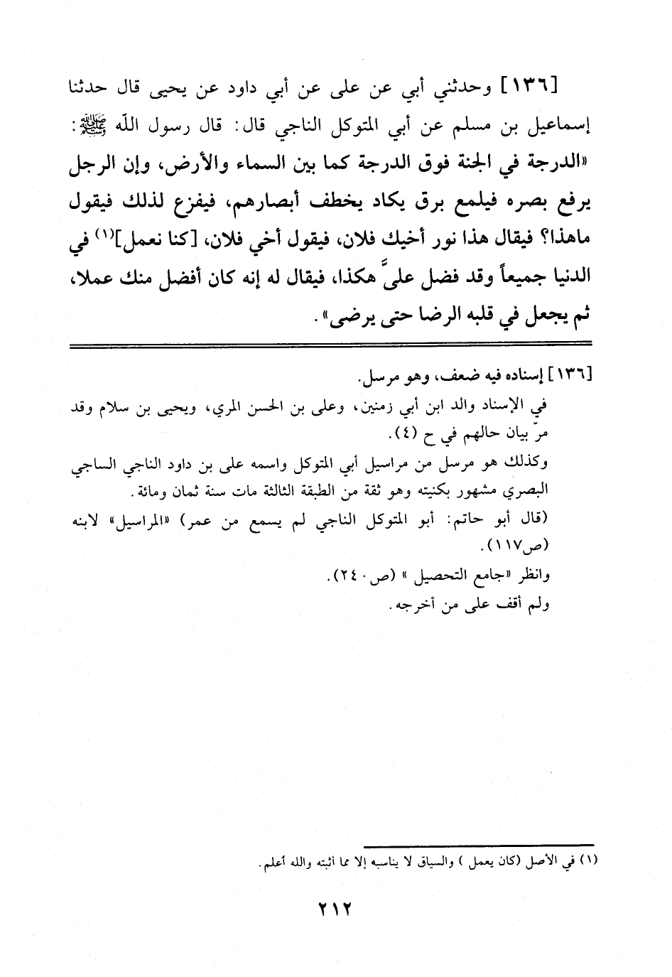 136 - وَحَدَّثَنِي أَبِي عَنْ عَلِيٍّ عَنْ أَبِي دَاوُدَ، عَنْ يَحْيَى قَالَ: حَدَّثَنَا إِسْمَاعِيلُ بْنُ مُسْلِمٍ عَنْ أَبِي اَلْمُتَوَكِّلِ النَّاجِيِّ قَالَ: قَالَ رَسُولُ اَللَّهِ صَلَّى اَللَّهُ عَلَيْهِ وَسَلَّمَ: اَلدَّرَجَةُ فِي اَلْجَنَّةِ فَوْقَ اَلدَّرَجَةِ كَمَا بَيْنَ اَلسَّمَاءِ وَالْأَرْضِ، وَإِنَّ اَلرَّجُلَ يَرْفَعُ بَصَرَهُ فَيَلْمَعُ بَرْقٌ يَكَادُ يَخْطَفُ أَبْصَارَهُمْ، فَيَفْزَعُ لِذَلِكَ فَيَقُولُ مَا هَذَا? فَيُقَالُ هَذَا نُورُ أَخِيكَ فُلَانٍ، فَيَقُولُ أَخِي فُلَانٍ، كُنَّا نَعْمَلُ فِي اَلدُّنْيَا جَمِيعًا وَقَدْ فَضَلَ عَلَيَّ هَكَذَا، فَيُقَالُ لَهُ: إِنَّهُ كَانَ أَفْضَلَ مِنْكَ عَمَلًا، ثُمَّ يُجْعَلُ فِي قَلْبِهِ اَلرِّضَا حَتَّى يَرْضَى