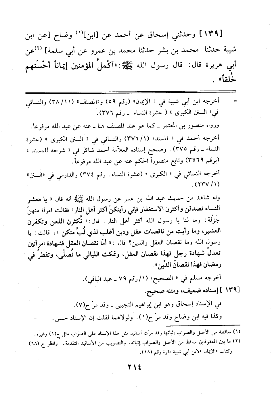 139 - وَحَدَّثَنِي إِسْحَاقُ عَنْ أَحْمَدَ عَنْ اِبْنِ وَضَّاحٍ عَنْ اِبْنِ شَيْبَةَ حَدَّثَنَا مُحَمَّدُ بْنُ بِشْرٍ، حَدَّثَنَا مُحَمَّدُ بْنُ عَمْرٍو، عَنْ أَبِي سَلَمَةَ، عَنْ أَبِي هُرَيْرَةَ قَالَ: قَالَ رَسُولُ اَللَّهِ صَلَّى اَللَّهُ عَلَيْهِ وَسَلَّمَ: أَكْمَلُ اَلْمُؤْمِنِينَ إِيمَانًا أَحْسَنُهُمْ خُلُقًا