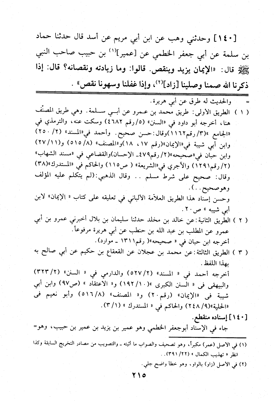 140 - وَحَدَّثَنِي وَهْبٌ عَنْ اِبْنِ أَبِي مَرْيَمَ، عَنْ أَسَدٍ قَالَ: حَدَّثَنَا حَمَّادُ بْنُ سَلَمَةَ، عَنْ أَبِي جَعْفَرٍ الْخَطْمِيِّ، عَنْ عُمَيْرِ بْنِ حَبِيبٍ صَاحِبِ اَلنَّبِيِّ صَلَّى اَللَّهُ عَلَيْهِ وَسَلَّمَ قَالَ: اَلْإِيمَانُ يَزِيدُ وَيَنْقُصُ قَالُوا: وَمَا زِيَادَتُهُ وَنُقْصَانُهُ? قَالَ: إِذَا ذَكَرْنَا اَللَّهَ وَصُمْنَا وَصَلَّيْنَا زَادَ، وَإِذَا غَفَلْنَا وَسَهَوْنَا نَقَصَ
