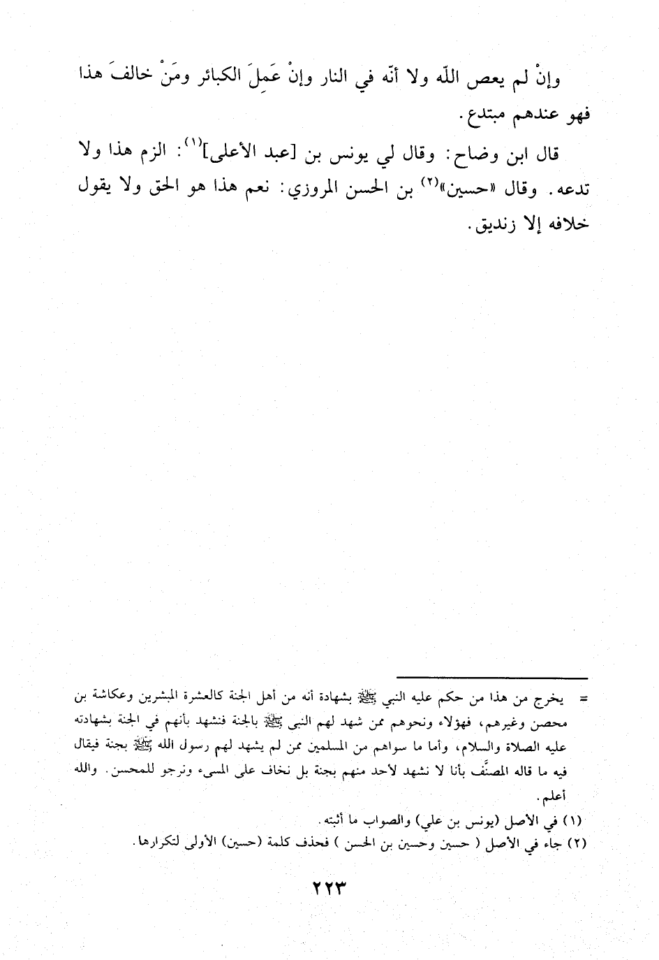 قَالَ اِبْنُ وَضَّاحٍ: وَقَالَ لِي يُونُسُ بْنُ عَبْد الْأَعْلَى: اِلْزَمْ هَذَا وَلَا تَدَعْهُ. وَقَالَ حُسَيْنُ بْنُ اَلْحَسَنِ الْمَرْوَزِيُّ: نَعَمْ، هَذَا هُوَ اَلْحَقُّ وَلَا يَقُولُ خِلَافَهُ إِلَّا زِنْدِيقٌ.