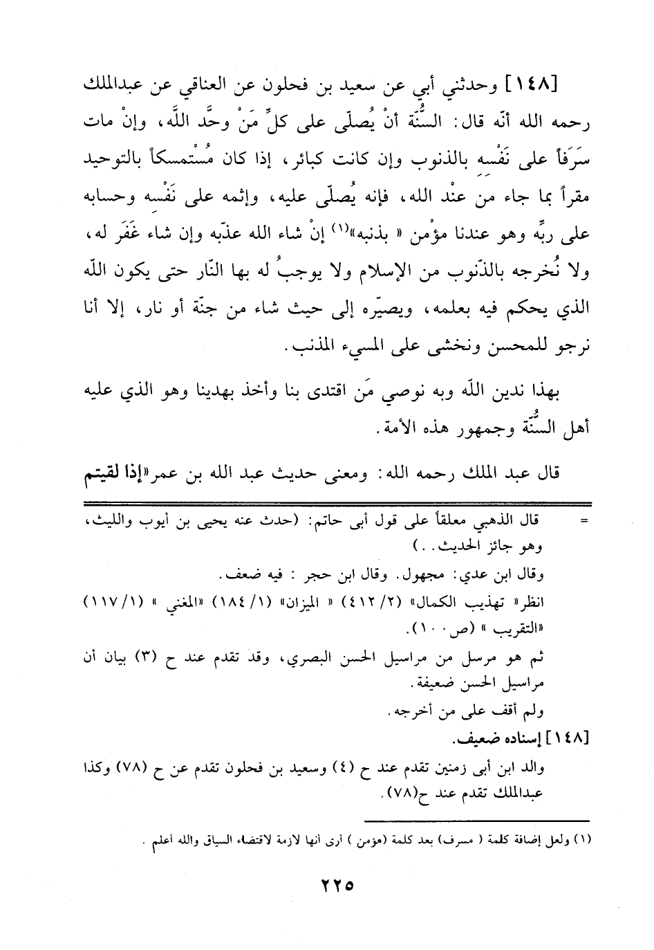 148 - وَحَدَّثَنِي أَبِي سَعِيدُ بْنُ فَحْلُونَ عَنْ اَلْعَنَاقِيِّ عَنْ عَبْدِ الْمَلِكِ رَحِمَهُ اَللَّهُ أَنَّهُ قَالَ: اَلسُّنَّةُ أَنْ يُصَلَّى عَلَى كُلِّ مَنْ وَحَّدَ اَللَّهَ، وَإِنْ مَاتَ مُسْرِفًا عَلَى نَفْسِهِ بِالذُّنُوبِ، وَإِنْ كَانَتْ كَبَائِرَ، إِذَا كَانَ مُسْتَمْسِكًا بِالتَّوْحِيدِ مُقِرًّا بِمَا جَاءَ مِنْ عِنْدِ اَللَّهِ، فَإِنَّهُ يُصَلَّى عَلَيْهِ، وَإِثْمُهُ عَلَى نَفْسِهِ وَحِسَابُهُ عَلَى رَبِّهِ، وَهُوَ عِنْدَنَا مُؤْمِنٌ بِذَنْبِهِ، إِنْ شَاءَ اَللَّهُ عَذَّبَهُ وَإِنْ شَاءَ غَفَرَ لَهُ، وَلَا نُخْرِجُهُ بِالذُّنُوبِ مِنْ اَلْإِسْلَامِ، وَلَا يُوجِبُ لَهُ بِهَا اَلنَّارَ حَتَّى يَكُونَ اَللَّهُ اَلَّذِي يَحْكُمُ فِيهِ بِعِلْمِهِ، وَيُصَيِّرُهُ إِلَى حَيْثُ شَاءَ مِنْ جَنَّةٍ أَوْ نَارٍ، إِلَّا أَنَّا نَرْجُو لِلْمُحْسِنِ وَنخْشَى عَلَى الْمُسِيءِ اَلْمُذْنِبِ.