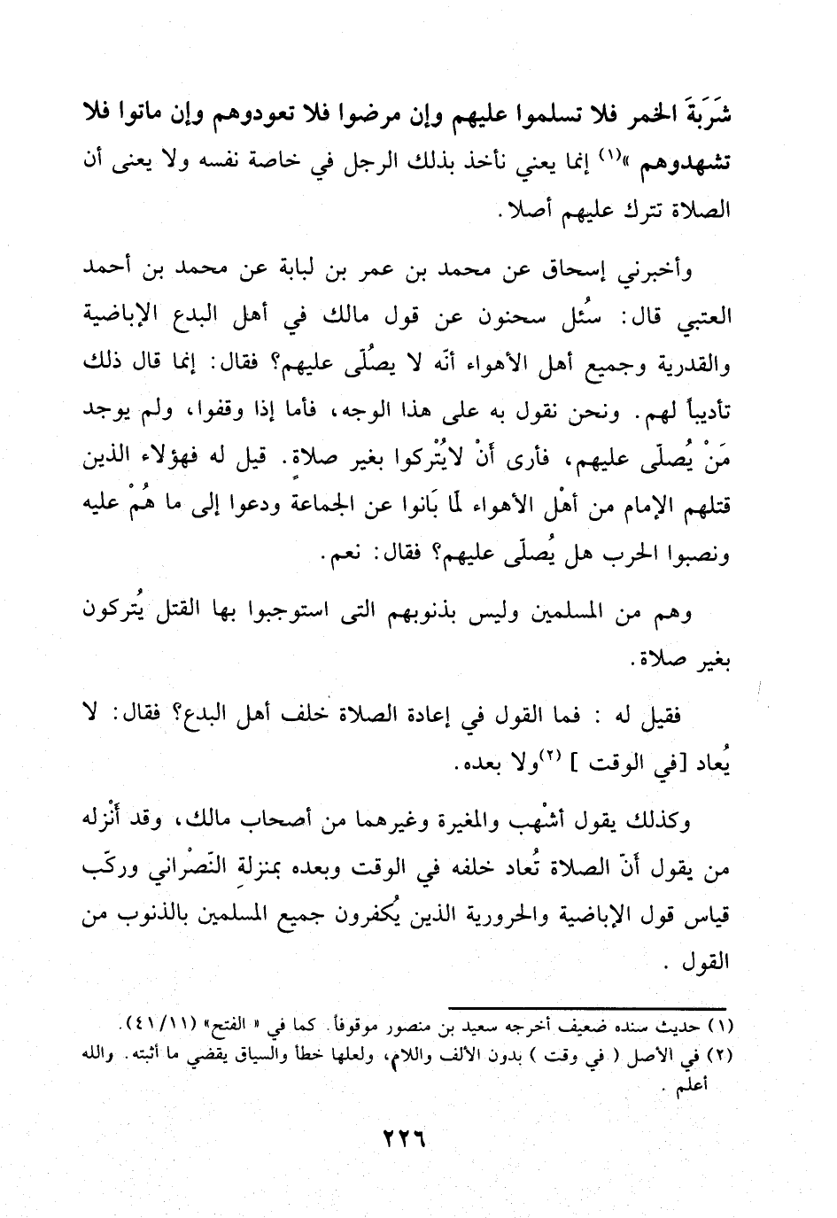 وَأَخْبَرَنِي إِسْحَاقُ عَنْ مُحَمَّدِ بْنِ عُمَرَ بْنِ لُبَابَةَ عَنْ مُحَمَّدِ بْنِ أَحْمَدَ اَلْعُتْبِيِّ قَالَ: سُئِلَ سَحْنُونُ عَنْ قَوْلِ مَالِكٍ فِي أَهْلِ اَلْبِدَعِ الْإِبَاضِيَّةِ وَالْقَدَرِيَّةِ وَجَمِيعِ أَهْلِ اَلْأَهْوَاءِ أَنَّهُ لَا يُصَلَّى عَلَيْهِمْ؟ فَقَالَ: إِنَّمَا قَالَ ذَلِكَ تَأْدِيبًا لَهُمْ، وَنَحْنُ نَقُولُ بِهِ عَلَى هَذَا اَلْوَجْهِ، فَأَمَّا إِذَا وُقِفُوا، وَلَمْ يُوجَدْ مَنْ يُصَلِّي عَلَيْهِمْ، فَأَرَى أَنْ لَا يُتْرَكُوا بِغَيْرِ صَلَاةٍ. قِيلَ لَهُ فَهَؤُلَاءِ اَلَّذِينَ قَتَلَهُمْ اَلْإِمَامُ مِنْ أَهْلِ اَلْأَهْوَاءِ لَمَّا بَانُوا عَنْ اَلْجَمَاعَةِ وَدَعَوْا إِلَى مَا هُمْ عَلَيْهِ وَنَصَبُوا اَلْحَرْبَ هَلْ يُصَلَّى عَلَيْهِمْ؟ فَقَالَ: نَعَمْ، وَهُمْ مِنْ اَلْمُسْلِمِينَ وَلَيْسَ بِذُنُوبِهِمْ اَلَّتِي اِسْتَوْجَبُوا بِهَا اَلْقَتْلَ يُتْرَكُونَ بِغَيْرِ صَلَاةٍ.