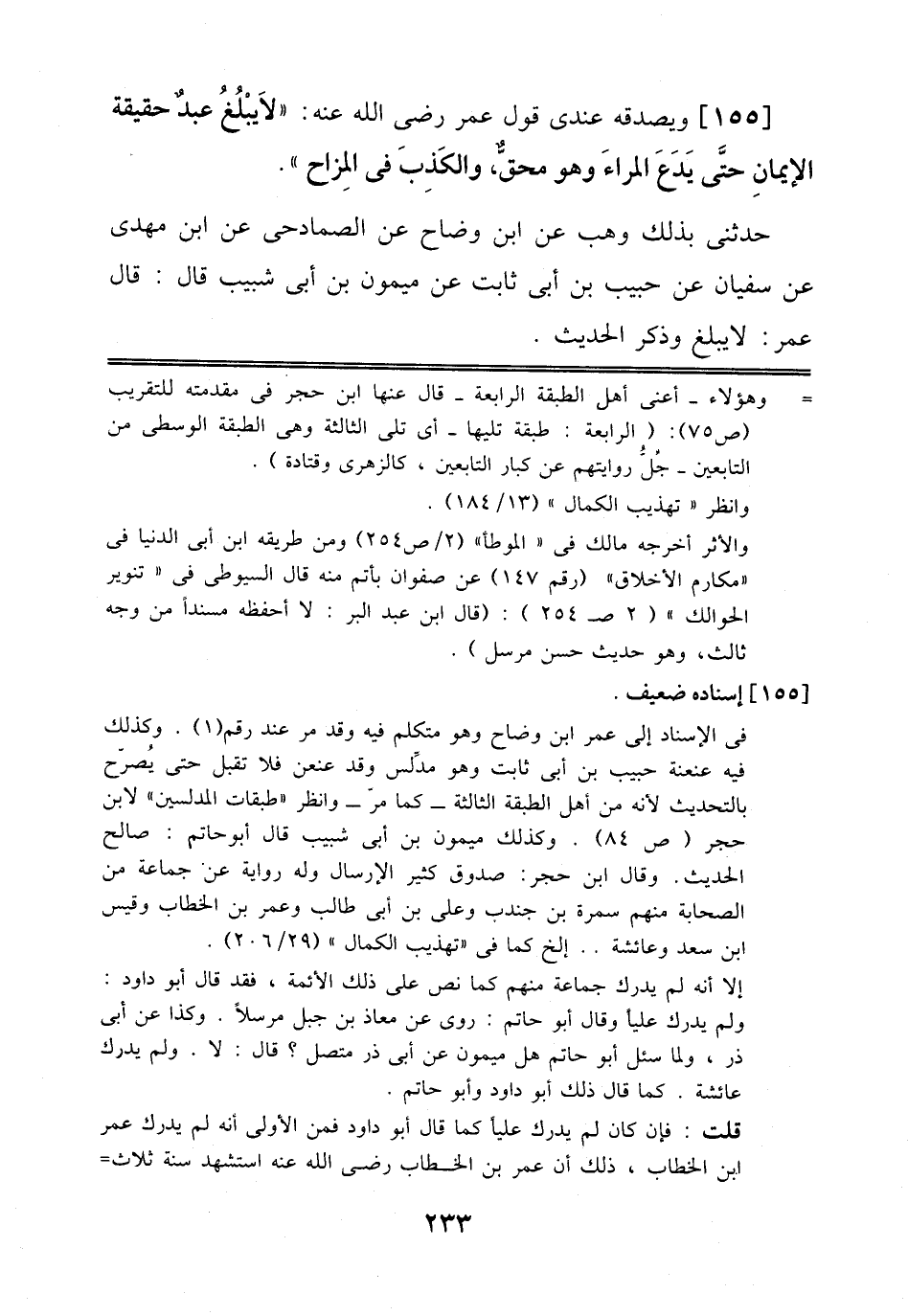 155 - وَيُصَدِّقُهُ عِنْدِي قَوْلُ عُمَرَ رَضِيَ اَللَّهُ عَنْهُ: "لَا يَبْلُغُ عَبْدٌ حَقِيقَةَ اَلْإِيمَانِ حَتَّى يَدَعَ اَلْمِرَاءَ وَهُوَ مُحِقٌّ، وَالْكَذِبَ فِي اَلْمِزَاحِ".