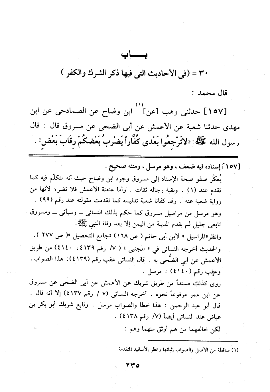 157 - حَدَّثَنِي وَهْبٌ عَنْ اِبْنِ وَضَّاحٍ، عَنْ الصُّمَادِحِيِّ، عَنْ اِبْنِ مَهْدِيٍّ حَدَّثَنَا شُعْبَةُ، عَنْ اَلْأَعْمَشِ، عَنْ أَبِي اَلضُّحَى، عَنْ مَسْرُوقٍ قَالَ: قَالَ رَسُولُ اَللَّهِ صَلَّى اَللَّهُ عَلَيْهِ وَسَلَّمَ: لَا تَرْجِعُوا بَعْدِي كُفَّارًا يَضْرِبُ بَعْضُكُمْ رِقَابَ بَعْضٍ