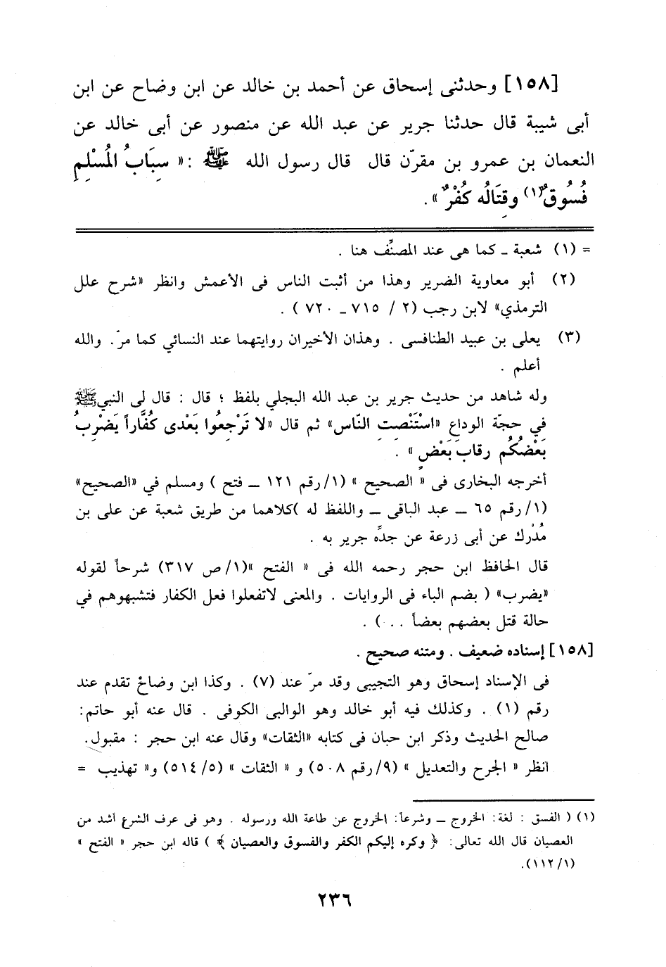 158 - وَحَدَّثَنِي إِسْحَاقُ عَنْ أَحْمَدَ بْنِ خَالِدٍ، عَنْ اِبْنِ وَضَّاحٍ، عَنْ اِبْنِ أَبِي شَيْبَةَ قَالَ: حَدَّثَنَا جَرِيرٌ عَنْ عَبْد اللَّه، عَنْ مَنْصُورٍ، عَنْ أَبِي خَالِدٍ، عَنْ اَلنُّعْمَانِ بْنِ عُمْرِو بْنِ مُقْرِنٍ قَالَ: قَالَ رَسُولُ اَللَّهِ صَلَّى اَللَّهُ عَلَيْهِ وَسَلَّمَ: سِبَابُ اَلْمُسْلِمِ فُسُوقٌ، وَقِتَالُهُ كُفْرٌ