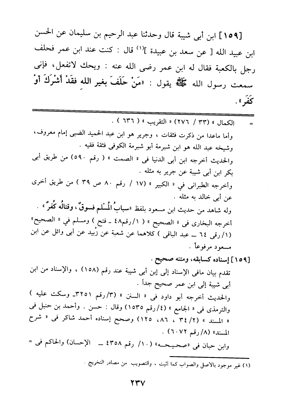 159 - اِبْنِ أَبِي شَيْبَةَ قَالَ: وَحَدَّثَنَا عَبْدُ الرَّحِيمِ بْنُ سُلَيْمَانَ، عَنْ اَلْحَسَنِ بْنِ عُبَيْدِ اللهِ، عَنْ سَعْدِ بْنِ عُبَيْدَةَ قَالَ: كُنْتُ عِنْدَ اِبْنِ عُمَرَ فَحَلَفَ رَجُلٌ بِالْكَعْبَةِ فَقَالَ لَهُ اِبْنُ عُمَرَ رَضِيَ اَللَّهُ عَنْهُ: وَيْحَكَ، لَا تَفْعَلْ، فَإِنِّي سَمِعْتُ رَسُولَ اَللَّهِ صَلَّى اَللَّهُ عَلَيْهِ وَسَلَّمَ يَقُولُ: مَنْ حَلَفَ بِغَيْرِ اَللَّهِ فَقَدْ أَشْرَكَ أَوْ كَفَرَ