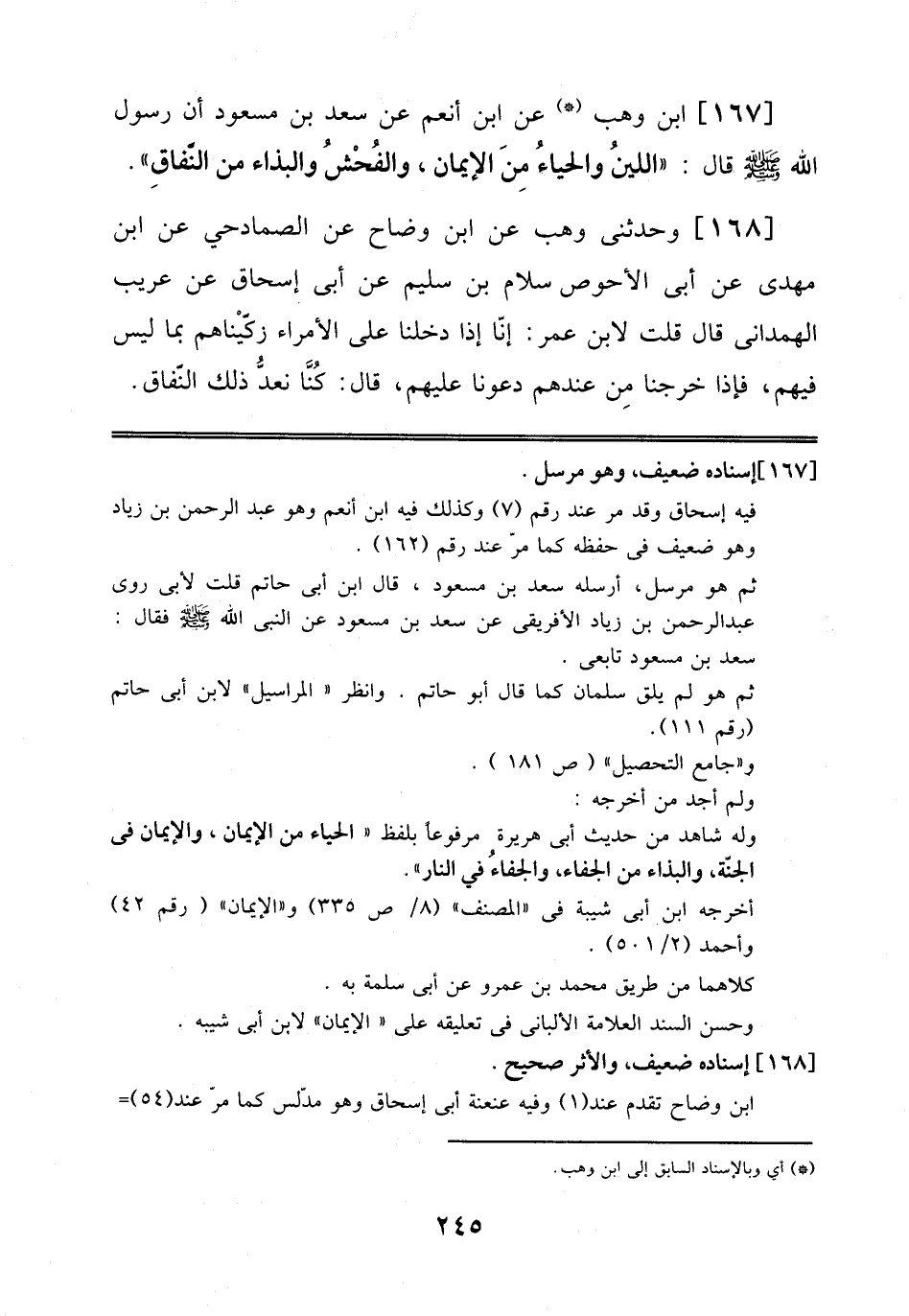 167 - اِبْنُ وَهْبٍ عَنْ اِبْنِ أَنْعَمَ عَنْ سَعْدِ بْنِ مَسْعُودٍ أَنَّ رَسُولَ اَللَّهِ صَلَّى اَللَّهُ عَلَيْهِ وَسَلَّمَ قَالَ: اَللِّينُ وَالْحَيَاءُ مِنْ اَلْإِيمَانِ، وَالْفُحْشُ وَالْبَذَاءُ مِنْ اَلنِّفَاقِ