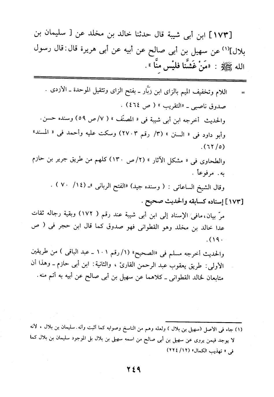 173 - اِبْنُ أَبِي شَيْبَةَ قَالَ: حَدَّثَنَا خَالِدُ بْنُ مَخْلَدٍ عَنْ سُلَيْمَانَ بْنِ بِلَالٍ عَنْ سُهَيْلِ بْنِ أَبِي صَالِحٍ عَنْ أَبِيهِ عَنْ أَبِي هُرَيْرَةَ قَالَ: قَالَ رَسُولُ اَللَّهِ صَلَّى اَللَّهُ عَلَيْهِ وَسَلَّمَ: مَنْ غَشَّنَا فَلَيْسَ مِنَّا