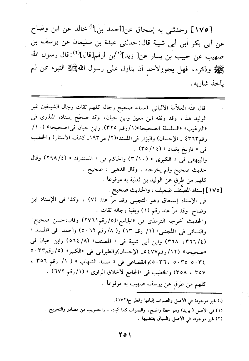 175 - وَحَدَّثَنِي بِهِ إِسْحَاقُ عَنْ أَحْمَدَ بْنِ خَالِدٍ، عَنْ اِبْنِ وَضَّاحٍ، عَنْ أَبِي بَكْرِ بْنِ أَبِي شَيْبَةَ قَالَ: حَدَّثَنِي عَبْدَةُ بْنُ سُلَيْمَانَ، عَنْ يُوسُفَ بْنِ صُهَيْبٍ عَنْ حَبِيبِ بْنِ يَسَارٍ، عَنْ زَيْدِ بْنِ أَرْقَمَ قَالَ: قَالَ رَسُولُ اَللَّهِ صَلَّى اَللَّهُ عَلَيْهِ وَسَلَّمَ وَذَكَرَهُ، فَهَلْ يَجُوزُ لِأَحَدٍ أَنْ يَتَأَوَّلَ عَلَى رَسُولِ اَللَّهِ صَلَّى اَللَّهُ عَلَيْهِ وَسَلَّمَ اَلتَّبَرُّؤ مِمَّنْ لَمْ يَأْخُذْ شَارِبَهُ