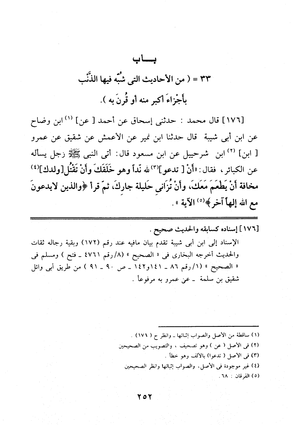 176 - قَالَ مُحَمَّدٌ: حَدَّثَنِي إِسْحَاقُ عَنْ أَحْمَدَ، عَنْ اِبْنِ وَضَّاحٍ، عَنْ اِبْنِ أَبِي شَيْبَةَ قَالَ: حَدَّثَنَا اِبْنُ نُمَيْرٍ، عَنْ اَلْأَعْمَشِ، عَنْ شَقِيقٍ، عَنْ عَمْرِو بْنِ َ شُرَحْبِيلَ عَنْ اِبْنِ مَسْعُودٍ قَالَ: أَتَى اَلنَّبِيَّ صَلَّى اَللَّهُ عَلَيْهِ وَسَلَّمَ رَجُلٌ يَسْأَلُهُ عَنْ اَلْكَبَائِرِ فَقَالَ: أَنْ تَدْعُوَ لِلَّهِ نِدًّا وَهُوَ خَلَقَك وَأَنْ تَقْتُلَ وَلَدَك مَخَافَةَ أَنْ يَطْعَمَ مَعَكَ، وَأَنْ تُزَانِيَ حَلِيلَةَ جَارِكَ، ثُمَّ قَرَأَ وَاَلَّذِينَ لَا يَدْعُونَ مَعَ اَللَّهِ إِلَهًا آخَرَاَلْآيَةَ