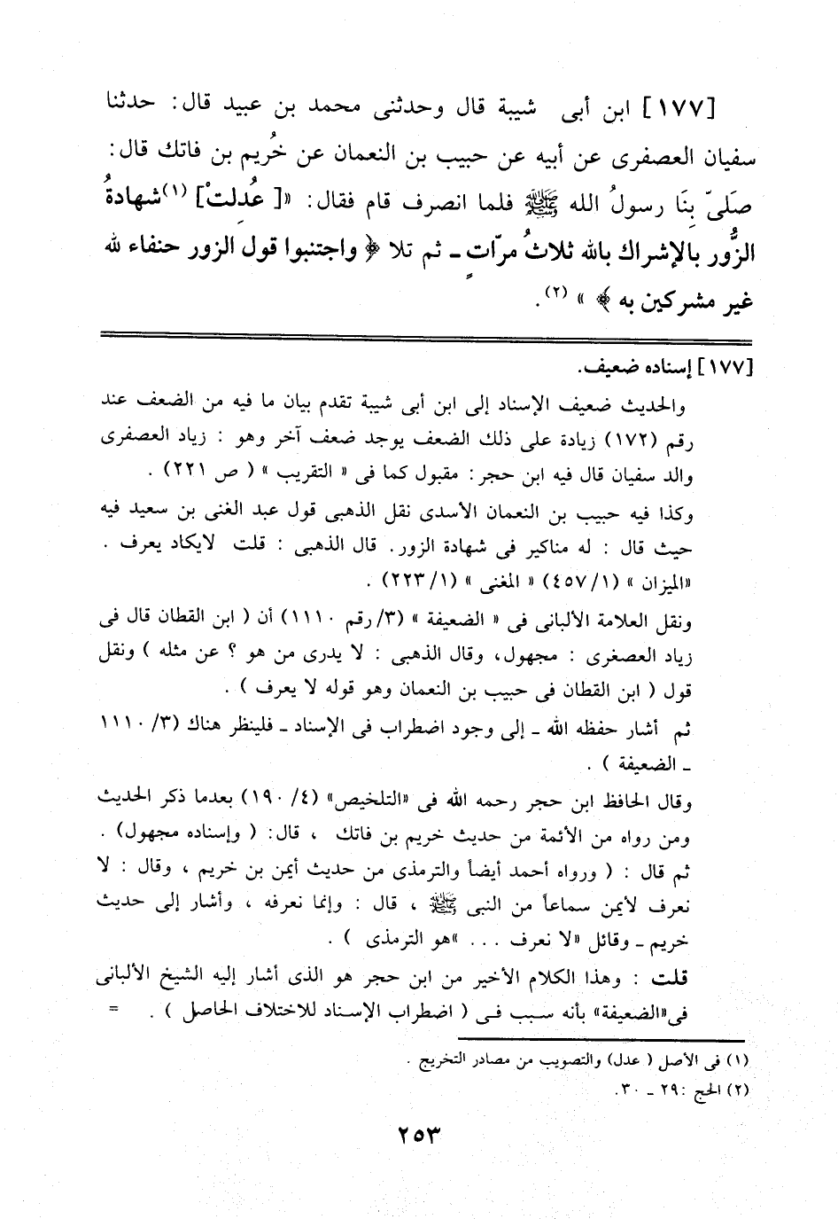 177 - اِبْنُ أَبِي شَيْبَةَ قَالَ: وَحَدَّثَنِي مُحَمَّدُ بْنُ عُبَيْدٍ قَالَ: حَدَّثَنَا سُفْيَانُ الْعُصْفُرِيُّ عَنْ أَبِيهِ، عَنْ حَبِيبِ بْنِ اَلنُّعْمَانِ، عَنْ خُرَيْمِ بْنِ فَاتِكٍ قَالَ: صَلَّى بِنَا رَسُولُ اَللَّهِ صَلَّى اَللَّهُ عَلَيْهِ وَسَلَّمَ فَلَمَّا اِنْصَرَفَ قَامَ فَقَالَ: عُدِلَتْ شَهَادَةُ اَلزُّورِ بِالْإِشْرَاكِ بِاَللَّهِ ثَلَاثَ مَرَّاتٍ ثُمَّ تَلَا: وَاجْتَنِبُوا قَوْلَ اَلزُّورِ حُنَفَاءَ لِلَّهِ غَيْرَ مُشْرِكِينَ بِهِ
