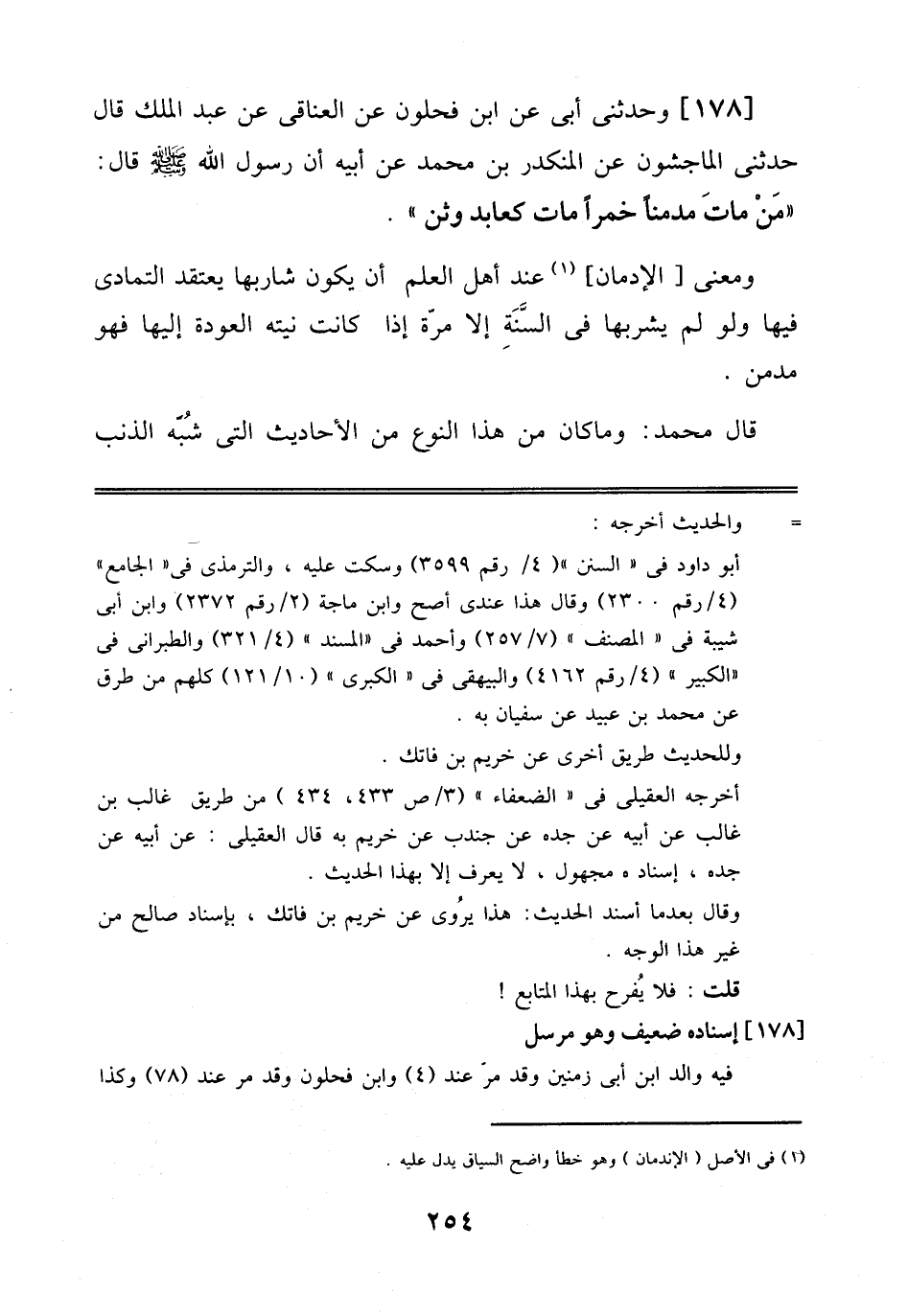 178 - وَحَدَّثَنِي أَبِي عَنْ اِبْنِ فَحْلُون عَنْ اَلْعِنَاقِيّ عَنْ عَبْد الْمَلِكِ قَالَ: حَدَّثَنِي الْمَاجِشُونُ عَنْ اَلْمُنْكَدِرِ بْنِ مُحَمَّدٍ عَنْ أَبِيهِ أَنَّ رَسُولَ اَللَّهِ صَلَّى اَللَّهُ عَلَيْهِ وَسَلَّمَ قَالَ: مَنْ مَاتَ مُدْمِنًا خَمْرًا مَاتَ كَعَابِدِ وَثَنٍ