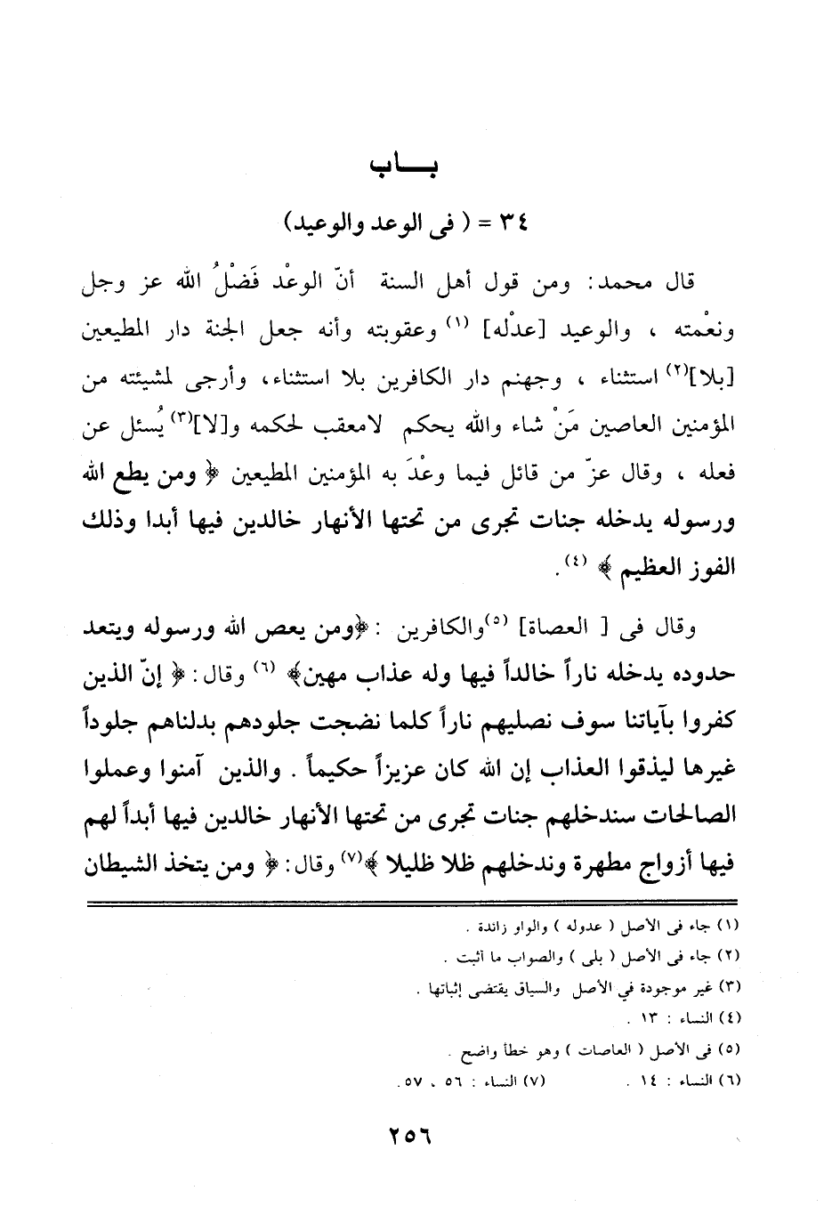 قَالَ مُحَمَّدٌ: وَمِنْ قَوْلِ أَهْلِ اَلسُّنَّةِ أَنَّ اَلْوَعْدَ فَضْلُ اَللَّهُ عَزَّ وَجَلَّ وَنِعْمَتُهُ، وَالْوَعِيدَ عَدْلُهُ وَعُقُوبَتُهُ وَأَنَّهُ جَعَلَ اَلْجَنَّةَ دَارَ اَلْمُطِيعِينَ بِلَا اِسْتِثْنَاءٍ، وَجَهَنَّمَ دَارَ اَلْكَافِرِينَ بِلَا اِسْتِثْنَاءٍ، وَأَرْجَى لِمَشِيئَتِهِ مِنَ اَلْمُؤْمِنِينَ اَلْعَاصِينَ مَنْ شَاءَ وَاَللَّهُ يَحْكُمُ لَا مُعَقِّبَ لِحُكْمِهِ وَلَا يُسْأَلُ عَنْ فِعْلِهِ، وَقَالَ عَزَّ مِنْ قَائِلٍ فِيمَا وَعَدَ بِهِ اَلْمُؤْمِنِينَ اَلْمُطِيعِينَ وَمَنْ يُطِعِ اَللَّهَ وَرَسُولَهُ يُدْخِلْهُ جَنَّاتٍ تَجْرِي مِنْ تَحْتِهَا اَلْأَنْهَارُ خَالِدِينَ فِيهَا وَذَلِكَ اَلْفَوْزُ اَلْعَظِيمُ