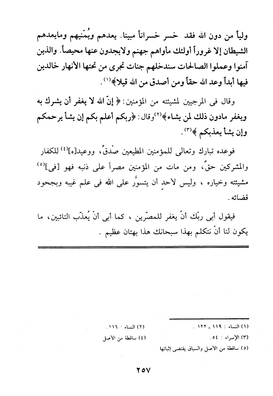 وَلِيًّا مِنْ دُونِ اَللَّهِ فَقَدْ خَسِرَ خُسْرَانًا مُبِينًايَعِدُهُمْ وَيُمَنِّيهِمْ وَمَا يَعِدُهُمُ اَلشَّيْطَانُ إِلَّا غُرُورًاأُولَئِكَ مَأْوَاهُمْ جَهَنَّمُ وَلَا يَجِدُونَ عَنْهَا مَحِيصًاوَاَلَّذِينَ آمَنُوا وَعَمِلُوا اَلصَّالِحَاتِ سَنُدْخِلُهُمْ جَنَّاتٍ تَجْرِي مِنْ تَحْتِهَا اَلْأَنْهَارُ خَالِدِينَ فِيهَا أَبَدًا وَعْدَ اَللَّهِ حَقًّا وَمَنْ أَصْدَقُ مِنَ اَللَّهِ قِيلًاوَقَالَ فِي اَلْمُرَجِّيِينَ لِمَشِيئَتِهِ مِنْ اَلْمُؤْمِنِينَ: إِنَّ اَللَّهَ لَا يَغْفِرُ أَنْ يُشْرَكَ بِهِ وَيَغْفِرُ مَا دُونَ ذَلِكَ لِمَنْ يَشَاءُوَقَالَ: رَبُّكُمْ أَعْلَمُ بِكُمْ إِنْ يَشَأْ يَرْحَمْكُمْ أَوْ إِنْ يَشَأْ يُعَذِّبْكُمْ