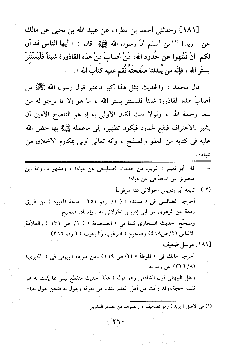 181 - وَحَدَّثَنِي أَحْمَدُ بْنُ مُطَرِّفٍ عَنْ عُبَيْدِ اللَّهِ بْنِ يَحْيَى، عَنْ مَالِكٍ عَنْ زَيْدٍ بْنِ أَسْلَمَ أَنَّ رَسُولَ اَللَّهِ صَلَّى اَللَّهُ عَلَيْهِ وَسَلَّمَ قَالَ: أَيُّهَا اَلنَّاسُ قَدْ آنَ لَكُمْ أَنْ تَنْتَهُوا عَنْ حُدُودِ اَللَّهِ، مَنْ أَصَابَ مِنْ هَذِهِ اَلْقَاذُورَةِ شَيْئًا فَلْيَسْتَتِرْ بِسِتْرِ اَللَّهِ، فَإِنَّهُ مَنْ يُبْدِ لَنَا صَفْحَتَهُ نُقِمْ عَلَيْهِ كِتَابَ اَللَّهِ