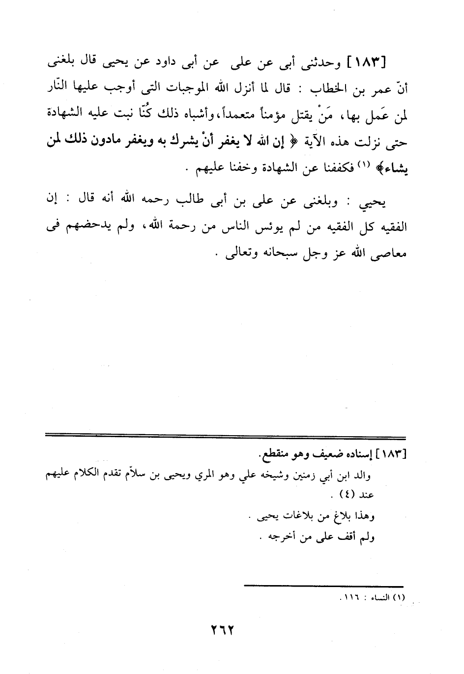 183 - وَحَدَّثَنِي أَبِي عَنْ عَلِيٍّ، عَنْ أَبِي دَاوُدَ، عَنْ يَحْيَى قَالَ: بَلَغَنِي أَنَّ عُمَرَ بْنَ اَلْخَطَّابِ قَالَ لَمَّا أَنْزَلَ اَللَّهُ اَلْمُوجِبَاتِ اَلَّتِي أَوْجَبَ عَلَيْهَا اَلنَّارَ لِمَنْ عَمِلَ بِهَا، مَنْ يَقْتُلْ مُؤْمِنًا مُتَعَمِّدًا، وَأَشْبَاهَ ذَلِكَ كُنَّا نَبُتّ عَلَيْهِ اَلشَّهَادَةَ حَتَّى نَزَلَتْ هَذِهِ اَلْآيَةُ: إِنَّ اَللَّهَ لَا يَغْفِرُ أَنْ يُشْرَكَ بِهِ وَيَغْفِرُ مَا دُونَ ذَلِكَ لِمَنْ يَشَاءُفَكَفَفْنَا عَنْ اَلشَّهَادَةِ وَخِفْنَا عَلَيْهِمْ.