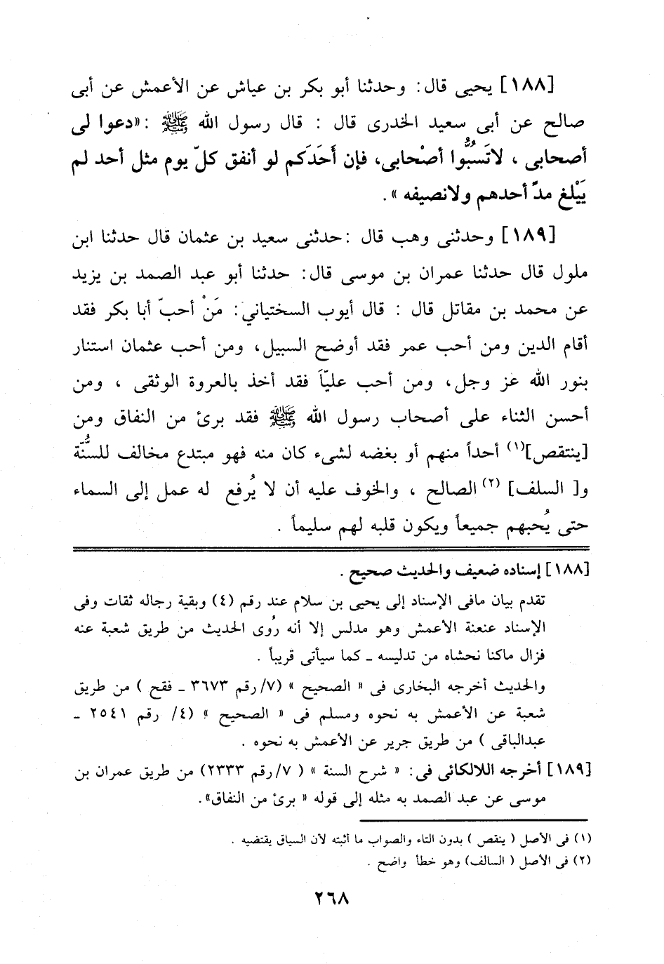 189 - وَحَدَّثَنِي وَهْبٌ قَالَ: حَدَّثَنِي سَعِيدُ بْنُ عُثْمَانَ قَالَ: حَدَّثَنَا اِبْنُ مَلُولٍ قَالَ: حَدَّثَنَا عِمْرَانُ بْنُ مُوسَى قَالَ: حَدَّثَنَا أَبُو عَبْدِ الصَّمَدِ بْنُ يَزِيدَ، عَنْ مُحَمَّدِ بْنِ مُقَاتِلٍ قَالَ: قَالَ أَيُّوبُ السَّخْتِيَانِيُّ: مَنْ أَحَبَّ أَبَا بَكْرٍ فَقَدْ أَقَامَ اَلدِّينَ، وَمَنْ أَحَبَّ عُمَرَ فَقَدْ أَوْضَحَ اَلسَّبِيلَ، وَمَنْ أَحَبَّ عُثْمَانَ اِسْتَنَارَ بِنُورِ اَللَّهِ عَزَّ وَجَلَّ، وَمَنْ أَحَبَّ عَلِيًّا فَقَدْ أَخَذَ بِالْعُرْوَةِ اَلْوُثْقَى، وَمَنْ أَحْسَنَ اَلثَّنَاءَ عَلَى أَصْحَابِ رَسُولِ اَللَّهِ صَلَّى اَللَّهُ عَلَيْهِ وَسَلَّمَ فَقَدْ بَرِئَ مِنْ اَلنِّفَاقِ وَمَنْ يَنْتَقِصُ أَحَدًا مِنْهُمْ أَوْ يُبْغِضُهُ لِشَيْءٍ كَانَ مِنْهُ فَهُوَ مُبْتَدِعٌ مُخَالِفٌ لِلسُّنَّةِ وَالسَّلَفِ اَلصَّالِحِ، وَالْخَوْفُ عَلَيْهِ أَنْ لَا يُرْفَعَ لَهُ عَمَلٌ إِلَى اَلسَّمَاءِ حَتَّى يُحِبَّهُمْ جَمِيعًا وَيَكُونَ قَلْبُهُ لَهُمْ سَلِيمًا.