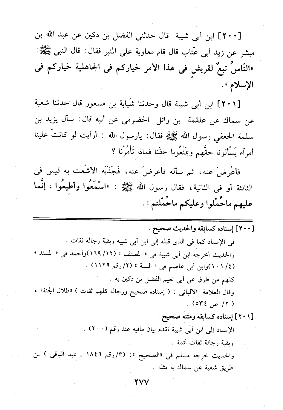 201 - ابْنُ أَبِي شَيْبَةَ قَالَ: وَحَدَّثَنَا شَبَابَهُ بْنُ مَسْعُورٍ قَالَ: حَدَّثَنَا شُعْبَةُ عَنْ سِمَاكٍ، عَنْ عَلْقَمَةَ بْنِ وَائِلٍ اَلْحَضْرَمِيِّ عَنْ أَبِيهِ قَالَ: سَأَلَ يَزِيدُ بْنُ سَلَمَةَ الْجُعْفِيُّ رَسُولَ اَللَّهِ صَلَّى اَللَّهُ عَلَيْهِ وَسَلَّمَ فَقَالَ: يَا رَسُولَ اَللَّهِ: أَرَأَيْتَ لَوْ كَانَتْ عَلَيْنَا أُمَرَاءُ يَسْأَلُونَا حَقَّهُمْ وَيَمْنَعُونَا حَقَّنَا فَمَاذَا تَأْمُرُنَا? فَأَعْرَضَ عَنْهُ، ثُمَّ سَأَلَهُ فَأَعْرَضَ عَنْهُ، فَجَذَبَهُ اَلْأَشْعَثُ بْنُ قَيْسٍ فِي اَلثَّالِثَةِ أَوْ فِي اَلثَّانِيَةِ، فَقَالَ رَسُولُ اَللَّهِ صَلَّى اَللَّهُ عَلَيْهِ وَسَلَّمَ: اِسْمَعُوا وَأَطِيعُوا، إِنَّمَا عَلَيْهِمْ مَا حُمِّلُوا وَعَلَيْكُمْ مَا حُمِّلْتُمْ