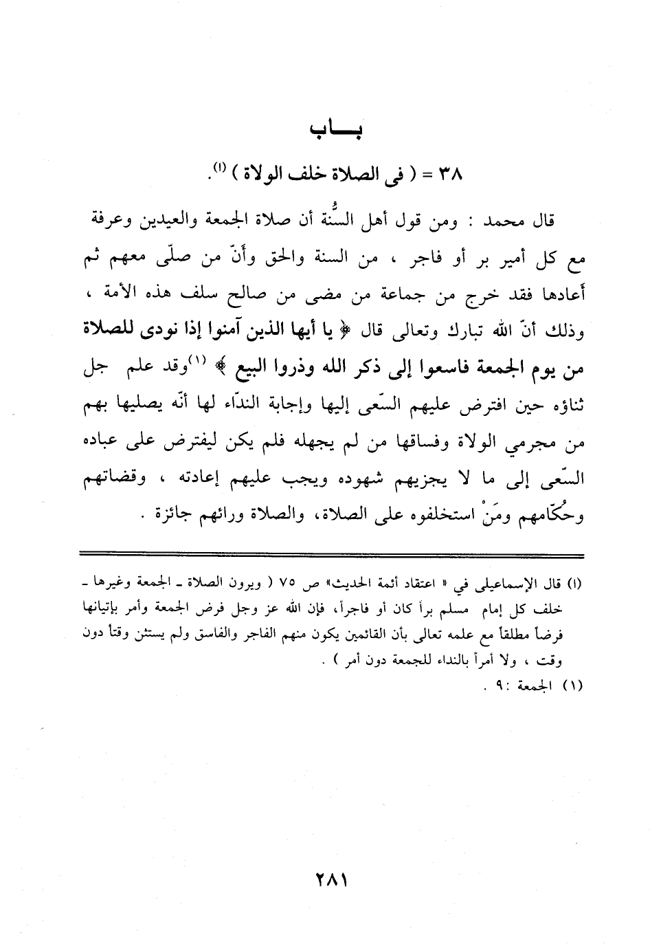 قَالَ مُحَمَّدٌ: وَمِنْ قَوْلِ أَهْلِ اَلسُّنَّةِ أَنَّ صَلَاةَ اَلْجُمُعَةِ وَالْعِيدَيْنِ وَعَرَفَةَ مَعَ كُلِّ أَمِيرٍ بَرٍّ أَوْ فَاجِرٍ، مِنْ اَلسُّنَّةِ وَالْحَقِّ وَأَنَّ مَنْ صَلَّى مَعَهُمْ ثُمَّ أَعَادَهَا فَقَدْ خَرَجَ مِنْ جَمَاعَةِ مَنْ مَضَى مِنْ صَالِحِ سَلَفِ هَذِهِ اَلْأُمَّةِ، وَذَلِكَ أَنَّ اَللَّهَ تَبَارَكَ وَتَعَالَى قَالَ: نُودِيَ لِلصَّلَاةِ مِنْ يَوْمِ اَلْجُمُعَةِ فَاسْعَوْا إِلَى ذِكْرِ اَللَّهِ وَذَرُوا اَلْبَيْعَ وَقَدْ عَلِمَ جَلَّ ثَنَاؤُهُ حِينَ اِفْتَرَضَ عَلَيْهِمْ اَلسَّعْيَ إِلَيْهَا وَإِجَابَةَ اَلنِّدَاءِ لَهَا أَنَّهُ يُصَلِّيهَا بِهِمْ مِنْ مُجْرِمِي اَلْوُلَاةِ وَفُسَّاقِهَا مَنْ لَمْ يَجْهَلْهُ فَلَمْ يَكُنْ لِيَفْتَرِضَ عَلَى عِبَادِهِ اَلسَّعْيَ إِلَى مَا لَا يَجْزِيهِمْ شُهُودُهُ وَيَجِبُ عَلَيْهِمْ إِعَادَتُهُ، وَقُضَاتِهِمْ وَحُكَّامِهِمْ وَمَنْ اِسْتَخْلَفُوهُ عَلَى اَلصَّلَاةِ، وَالصَّلَاةُ وَرَاءَهُمْ جَائِزَةٌ.