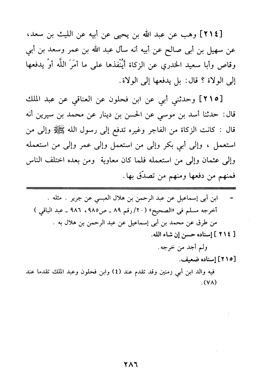 214 - وَهْبٌ عَنْ عَبْدِ اللهِ بْنِ يَحْيَى عَنْ أَبِيهِ، عَنْ اَللَّيْثِ بْنِ سَعْدٍ، عَنْ سُهَيْلِ بْنِ أَبِي صَالِحٍ، عَنْ أَبِيهِ أَنَّهُ سَأَلَ عَبْدَ اللهِ بْنَ عُمَرَ وَسَعْدَ بْنَ أَبِي وَقَّاصٍ وَأَبَا سَعِيدٍ اَلْخُدْرِيَّ عَنْ اَلزَّكَاةِ أَيُنْفِذُهَا عَلَى مَا أَمَرَ اَللَّهُ أَوْ يَدْفَعُهَا إِلَى اَلْوُلَاةِ? قَالَ: بَلْ يَدْفَعُهَا إِلَى اَلْوُلَاةِ.