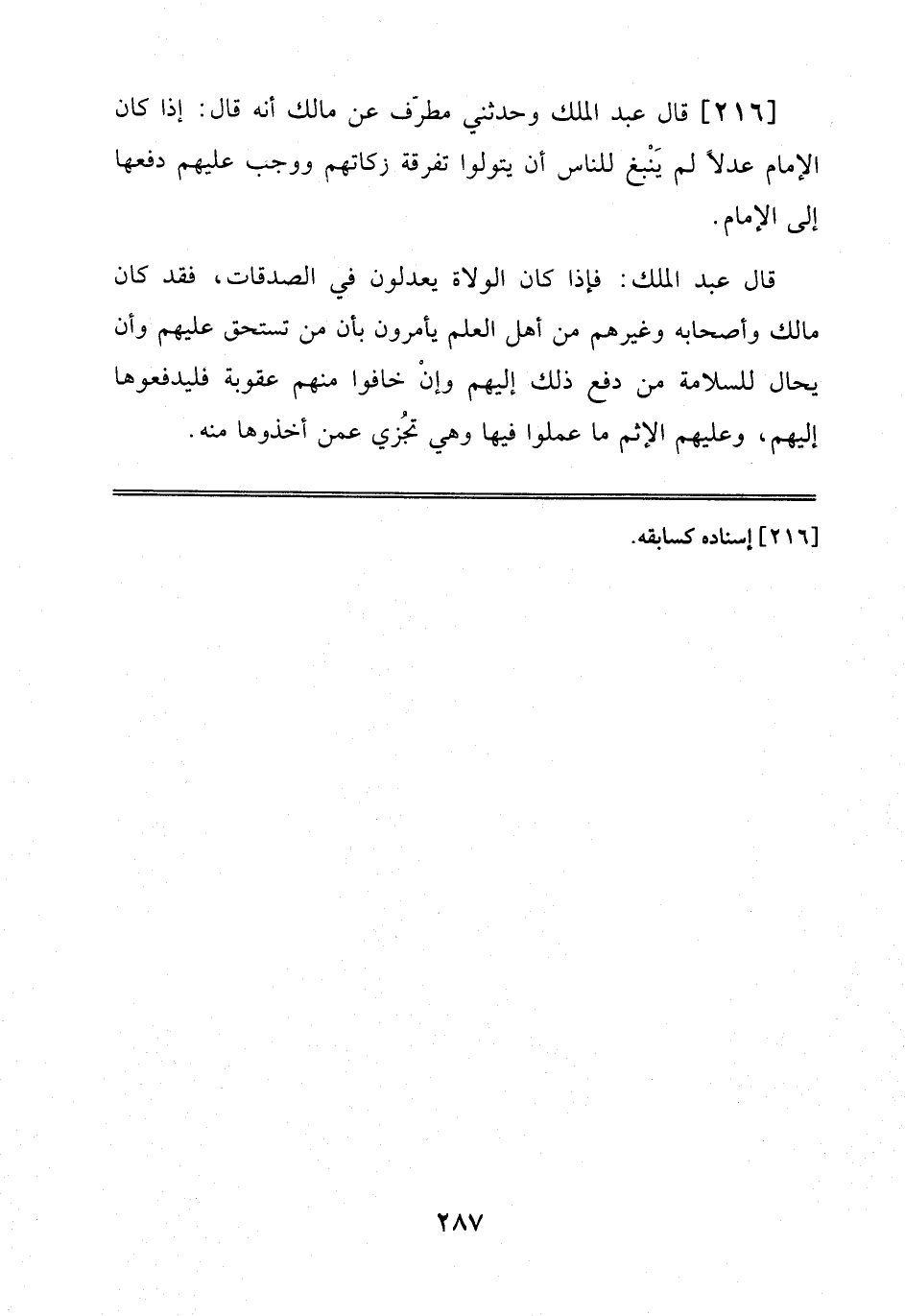 216 - قَالَ عَبْدُ الْمَلِكِ وَحَدَّثَنِي مُطَرِّفٌ عَنْ مَالِكٍ أَنَّهُ قَالَ: إِذَا كَانَ اَلْإِمَامُ عَدْلًا لَمْ يَنْبَغِ لِلنَّاسِ أَنْ يَتَوَلَّوْا تَفْرِقَةَ زَكَاتِهِمْ وَوَجَبَ عَلَيْهِمْ دَفْعُهَا إِلَى اَلْإِمَامِ.