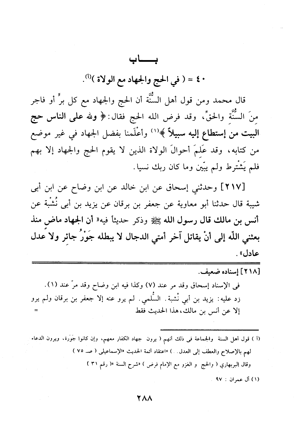 قَالَ مُحَمَّدٌ: وَمِنْ قَوْلِ أَهْلِ اَلسُّنَّةِ إِنَّ اَلْحَجَّ وَالْجِهَادَ مَعَ كُلِّ بَرٍّ أَوْ فَاجِرٍ مِنْ اَلسُّنَّةِ وَالْحَقِّ، وَقَدْ فَرَضَ اَللَّهُ اَلْحَجَّ فَقَالَ: وَلِلَّهِ عَلَى اَلنَّاسِ حِجُّ اَلْبَيْتِ مَنِ اِسْتَطَاعَ إِلَيْهِ سَبِيلًا وَأَعْلَمَنَا بِفَضْلِ اَلْجِهَادِ فِي غَيْرِ مَوْضِعٍ مِنْ كِتَابِهِ، وَقَدْ عَلِمَ أَحْوَالَ اَلْوُلَاةِ اَلَّذِينَ لَا يَقُومُ اَلْحَجُّ وَالْجِهَادُ إِلَّا بِهِمْ فَلَمْ يَشْتَرِطْ وَلَمْ يُبَيِّنْ وَمَا كَانَ رَبُّكَ نَسِيًّا.
