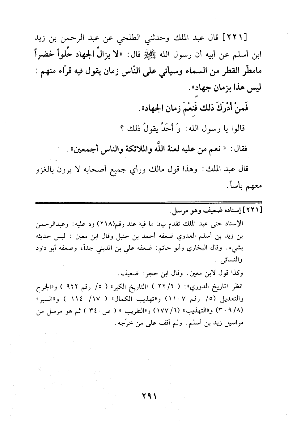221 - قَالَ عَبْد الْمَلِكِ وَحَدَّثَنِي الطَّلْحِيُّ عَنْ عَبْد الرَّحْمَنِ بْنِ زَيْدِ بْنِ أَسْلَمَ، عَنْ أَبِيهِ أَنَّ رَسُولَ اَللَّهِ صَلَّى اَللَّهُ عَلَيْهِ وَسَلَّمَ قَالَ: لَا يَزَالُ اَلْجِهَادُ حُلْوًا خَضِرًا مَا مَطَرَ اَلْقَطْرُ مِنْ اَلسَّمَاءِ وَسَيَأْتِي عَلَى اَلنَّاسِ زَمَانٌ يَقُولُ فِيهِ قُرَّاءٌ مِنْهُمْ: لَيْسَ هَذَا بِزَمَانِ جِهَادٍ، فَمَنْ أَدْرَكَ ذَلِكَ فَنِعْمَ زَمَانُ اَلْجِهَادِ.