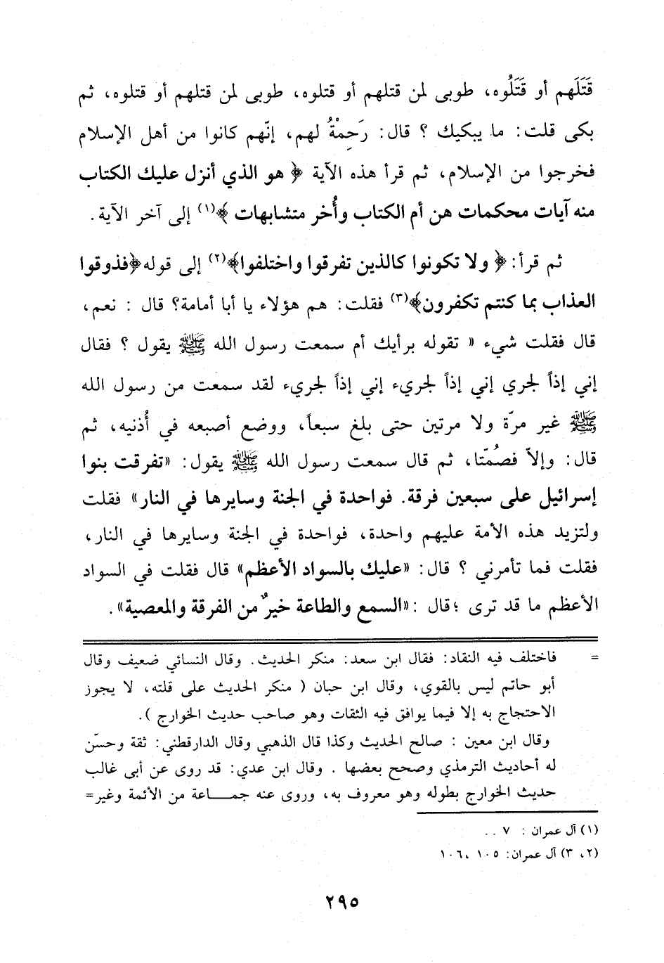 قَتَلَهُمْ أَوْ قَتَلُوهُ، طُوبَى لِمَنْ قَتَلَهُمْ أَوْ قَتَلُوهُ، طُوبَى لِمَنْ قَتَلَهُمْ أَوْ قَتَلُوهُ، ثُمَّ بَكَى قُلْتُ: مَا يُبْكِيكَ? قَالَ: رَحْمَةً لَهُمْ، إِنَّهُمْ كَانُوا مِنْ أَهْلِ اَلْإِسْلَامِ فَخَرَجُوا مِنْ اَلْإِسْلَامِ، ثُمَّ قَرَأَ اَلَّذِي أَنْزَلَ عَلَيْكَ اَلْكِتَابَ مِنْهُ آيَاتٌ مُحْكَمَاتٌ هُنَّ أُمُّ اَلْكِتَابِ وَأُخَرُ مُتَشَابِهَاتٌإِلَى آخِرِ اَلْآيَةِ، ثُمَّ قَرَأَ وَلَا تَكُونُوا كَاَلَّذِينَ تَفَرَّقُوا وَاخْتَلَفُواإِلَى قَوْلِهِ فَذُوقُوا اَلْعَذَابَ بِمَا كُنْتُمْ تَكْفُرُونَفَقُلْتُ: هُمْ هَؤُلَاءِ يَا أَبَا أُمَامَةَ? قَالَ: نَعَمْ، قَالَ: فَقُلْتُ شَيْءٌ تَقُولُهُ بِرَأْيِكَ أَمْ سَمِعْتَ رَسُولَ اَللَّهِ صَلَّى اَللَّهُ عَلَيْهِ وَسَلَّمَ يَقُولُ? فَقَالَ: إِنِّي إِذًا لَجَرِيءٌ إِنِّي إِذًا لَجَرِيءٌ، إِنِّي إِذًا لَجَرِيءٌ لَقَدْ سَمِعْتُ رَسُولَ اَللَّهِ صَلَّى اَللَّهُ عَلَيْهِ وَسَلَّمَ غَيْرَ مَرَّة وَلَا مَرَّتَيْنِ حَتَّى بَلَغَ سَبْعًا، وَوَضَعَ أُصْبُعَهُ فِي أُذُنِيهِ، ثُمَّ قَالَ: وَإِلَّا فَصُمَّتَا، ثُمَّ قَالَ: سَمِعْتُ رَسُولَ