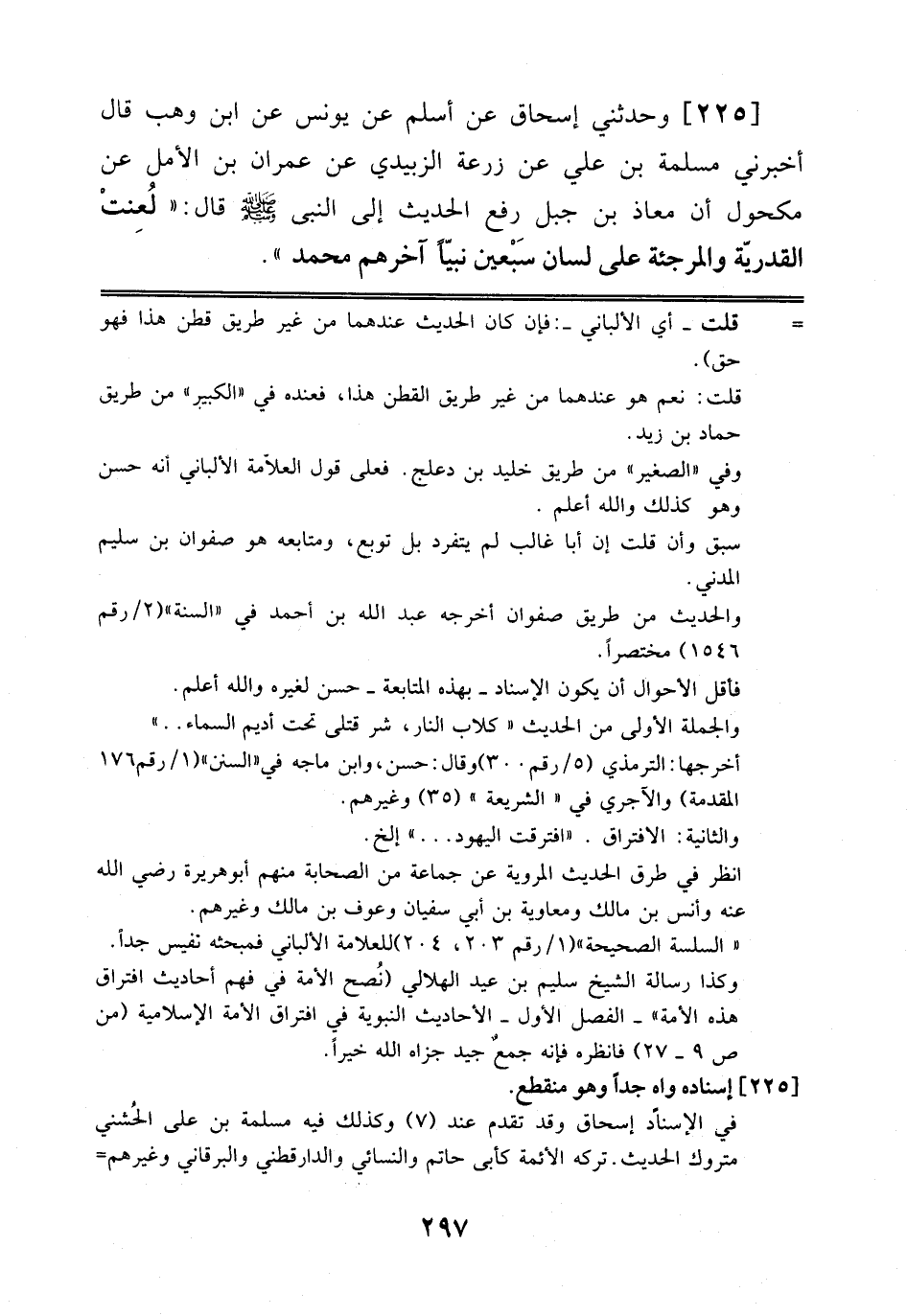 225 - وَحَدَّثَنِي إِسْحَاقُ عَنْ أَسْلَمَ عَنْ يُونُسَ عَنْ اِبْنِ وَهْبٍ قَالَ: أَخْبَرَنِي مَسْلَمَةُ بْنُ عَلِيٍّ عَنْ زُرْعَةَ اَلزُّبَيْدِيِّ عَنْ عِمْرَانَ بْنِ اَلْأَمَلِ عَنْ مَكْحُولٍ أَنَّ مُعَاذَ بْنَ جَبَلٍ رَفَعَ اَلْحَدِيثَ إِلَى اَلنَّبِيِّ صَلَّى اَللَّهُ عَلَيْهِ وَسَلَّمَ قَالَ: لُعِنَتْ اَلْقَدَرِيَّةُ وَالْمُرْجِئَةُ عَلَى لِسَانِ سَبْعِينَ نَبِيًّا آخِرُهُمْ مُحَمَّدٌ