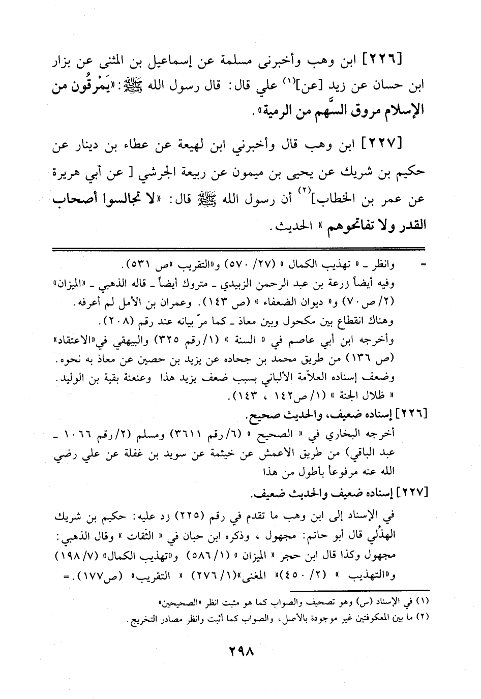 227 - اِبْنُ وَهْبٍ قَالَ: وَأَخْبَرَنِي اِبْنُ لَهِيعَةَ عَنْ عَطَاءِ بْنِ دِينَارٍ عَنْ حَكِيمِ بْنِ شَرِيكٍ عَنْ يَحْيَى بْنِ مَيْمُونٍ عَنْ رَبِيعَةَ الْجُرَشِيِّ عَنْ أَبِي هُرَيْرَةَ عَنْ عُمَرَ بْنِ اَلْخَطَّابِ أَنَّ رَسُولَ اَللَّهِ صَلَّى اَللَّهُ عَلَيْهِ وَسَلَّمَ قَالَ: لَا تُجَالِسُوا أَصْحَابَ اَلْقَدَرِ وَلَا تُفَاتِحُوهُمْ اَلْحَدِيثَ.