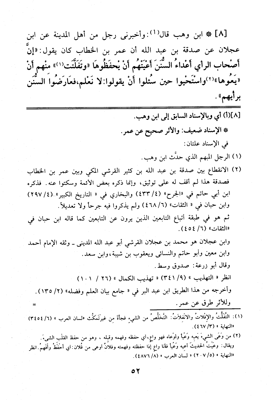 8 - ابْنُ وَهْبٍ قَالَ: وَأَخْبَرَنِي رَجُلٌ مِنْ أَهْلِ اَلْمَدِينَةِ عَنْ اِبْن عَجْلَانَ، عَنْ صَدَقَةَ بْنِ عَبْدِ اللَّهِ أَنَّ عُمَرَ بْنَ اَلْخَطَّابِ كَانَ يَقُولُ: "إِنَّ أَصْحَابَ اَلرَّأْيِ أَعْدَاءَ اَلسُّنَنِ أَعْيَتْهُمْ أَنْ يَحْفَظُوهَا وَتَفَلَّتَ مِنْهُمْ أَنْ يَعُوهَا، وَاسْتَحْيَوْا حِينَ سُئِلُوا أَنْ يَقُولُوا: لَا نَعْلَمُ، فَعَارَضُوا اَلسُّنَنَ بِرَأْيِهِمْ".