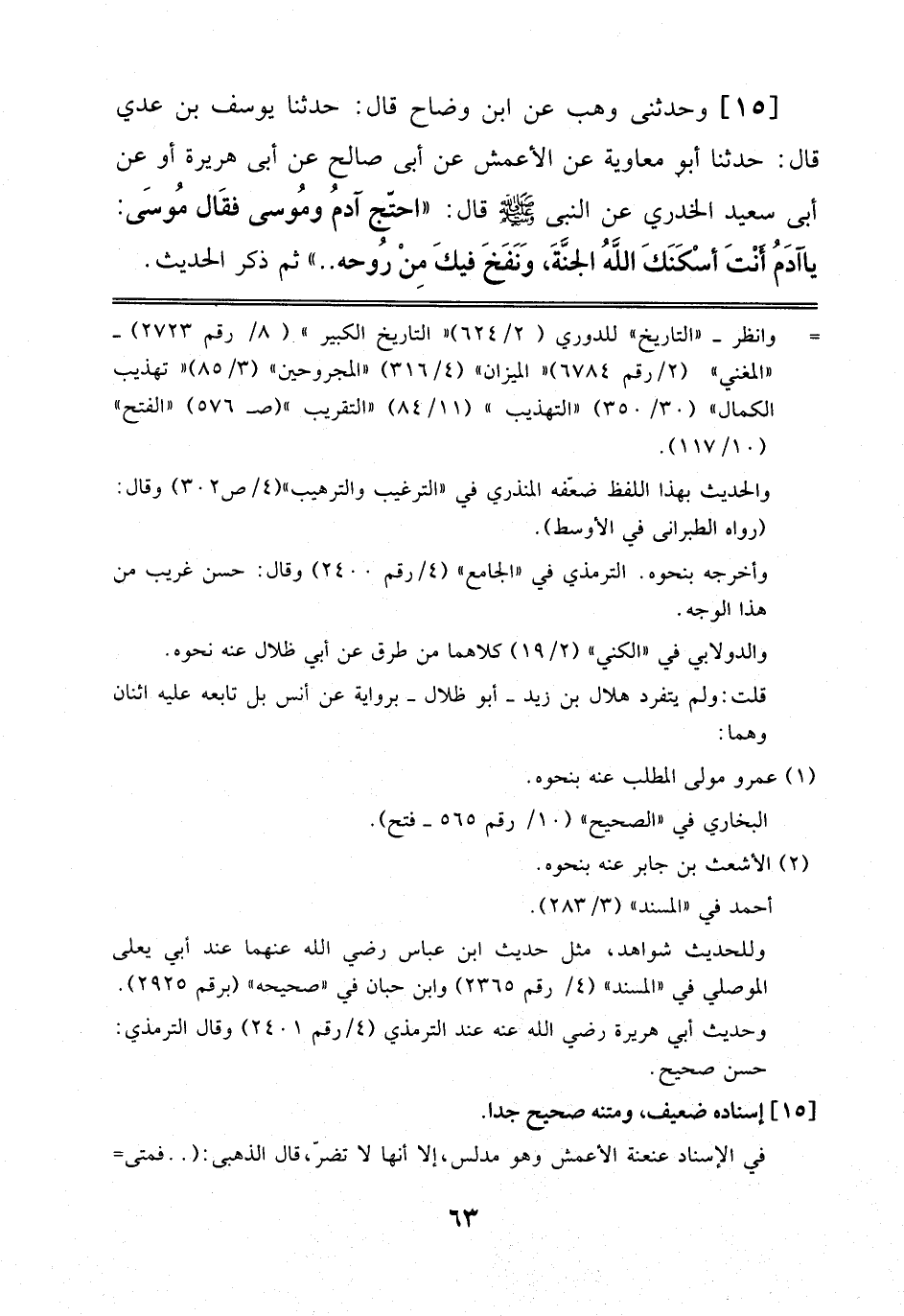 15 - وَحَدَّثَنِي وَهْبٌ عَنْ اِبْنِ وَضَّاحٍ قَالَ: حَدَّثَنَا يُوسُفُ بْنُ عَدِيٍّ قَالَ: حَدَّثَنَا أَبُو مُعَاوِيَةَ، عَنْ اَلْأَعْمَشِ، عَنْ أَبِي صَالِحٍ، عَنْ أَبِي هُرَيْرَةَ، أَوْ عَنْ أَبِي سَعِيدٍ اَلْخُدْرِيِّ، عَنْ اَلنَّبِيِّ صَلَّى اَللَّهُ عَلَيْهِ وَسَلَّمَ قَالَ: اِحْتَجَّ آدَمُ وَمُوسَى فَقَالَ مُوسَى يَا آدَمُ أَنْتَ أَسْكَنَك اَللَّهُ اَلْجَنَّةَ، وَنَفَخَ فِيكَ مِنْ رُوحِهِ ... ثُمَّ ذَكَرَ اَلْحَدِيثَ.