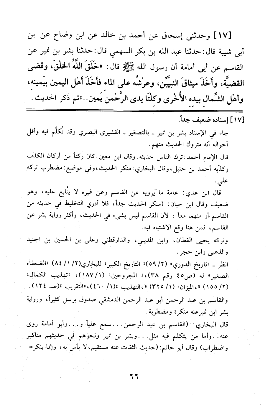 17 - وَحَدَّثَنِي إِسْحَاقُ عَنْ أَحْمَدَ بْنِ خَالِدٍ، عَنْ اِبْنِ وَضَّاحٍ، عَنْ اِبْنِ أَبِي شَيْبَةَ قَالَ: حَدَّثَنَا عَبْد اللهِ بْنُ بَكْرٍ اَلسَّهْمِيُّ قَالَ: حَدَّثَنَا بِشْرُ بْنُ نُمَيْرٍ، عَنْ اَلْقَاسِمِ، عَنْ أَبِي أُمَامَةَ أَنَّ رَسُولَ اَللَّهِ صَلَّى اَللَّهُ عَلَيْهِ وَسَلَّمَ قَالَ: خَلَقَ اَللَّهُ اَلْخَلْقَ، وَقَضَى اَلْقَضِيَّةَ، وَأَخَذَ مِيثَاقَ اَلنَّبِيِّينَ، وَعَرْشُهُ عَلَى اَلْمَاءِ فَأَخَذَ أَهْلَ اَلْيَمِينِ بِيَمِينِهِ، وَأَهْلَ اَلشِّمَالِ بِيَدِهِ اَلْأُخْرَى، وَكِلْتَا يَدِ اَلرَّحْمَنِ يَمِينٌ ... ثُمَّ ذَكَرَ اَلْحَدِيثَ.