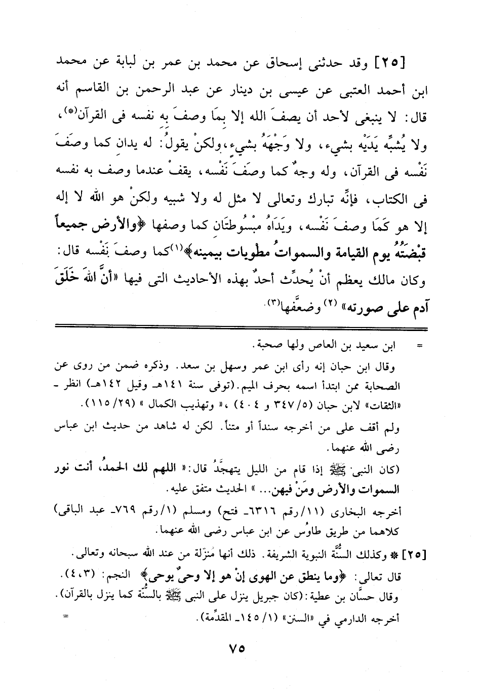25 - وَقَدْ حَدَّثَنِي إِسْحَاقُ، عَنْ مُحَمَّدِ بْنِ عُمَرَ بْنِ لُبَابَةَ، عَنْ مُحَمَّدِ بْنِ أَحْمَد اَلْعتْبِي، عَنْ عِيسَى بْنِ دِينَارٍ، عَنْ عبد الرحمن بْنِ اَلْقَاسِمِ أَنَّهُ قَالَ: لَا يَنْبَغِي لِأَحَدٍ أَنْ يَصِفَ اَللَّهَ إِلَّا بِمَا وَصَفَ بِهِ نَفْسَهُ فِي اَلْقُرْآنِ، وَلَا يُشَبِّهُ يَدَيْهِ بِشَيْءٍ، وَلَا وَجْهَهُ بِشَيْءٍ، وَلَكِنْ يَقُولُ: لَهُ يَدَانِ كَمَا وَصَفَ نَفْسَهُ فِي اَلْقُرْآنِ، وَلَهُ وَجْهٌ كَمَا وَصَفَ نَفْسَهُ، يَقِفُ عِنْدَمَا وَصَفَ بِهِ نَفْسَهُ فِي اَلْكِتَابِ، فَإِنَّهُ تَبَارَكَ وَتَعَالَى لَا مِثْلَ لَهُ وَلَا شَبِيهَ وَلَكِنْ هُوَ اَللَّهُ لَا إِلَهَ إِلَّا هُوَ كَمَا وَصَفَ نَفْسَهُ، وَيَدَاهُ مَبْسُوطَتَانِ كَمَا وَصَفَهَا: وَالْأَرْضُ جَمِيعًا قَبْضَتُهُ يَوْمَ اَلْقِيَامَةِ وَالسَّمَاوَاتُ مَطْوِيَّاتٌ بِيَمِينِهِكَمَا وَصَفَ نَفْسَهُ قَالَ: وَكَانَ مَالِكٌ يُعَظِّمُ أَنْ يُحَدِّثَ أَحَدٌ بِهَذِهِ اَلْأَحَادِيثِ اَلَّتِي فِيهَا: أَنَّ اَللَّهَ خَلَقَ آدَمَ عَلَى صُورَتِهِ وَضَعَّفَهَا.