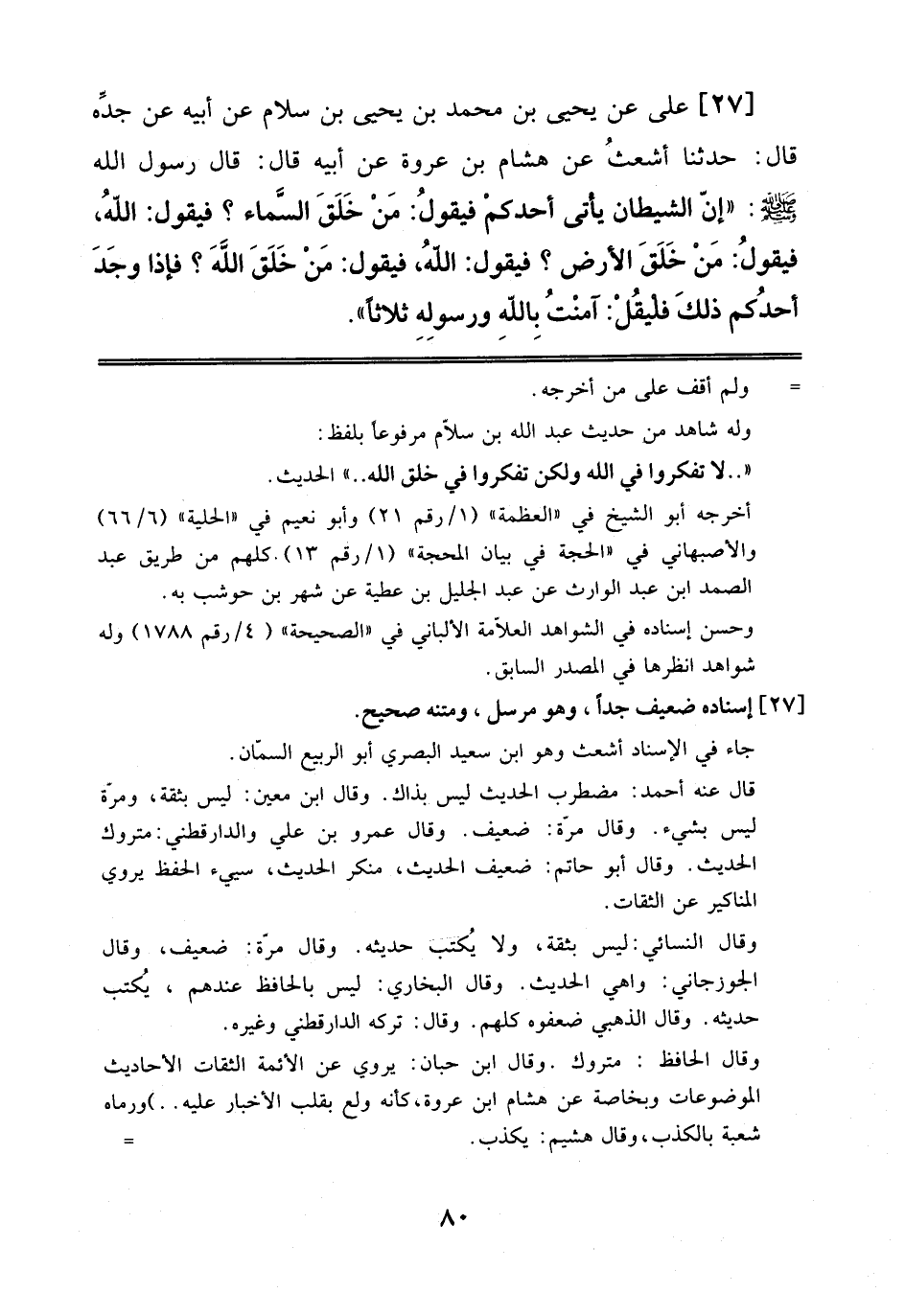 27 - عَلِيُّ عَنْ يَحْيَى بْنِ مُحَمَّدٍ بْنِ يَحْيَى بْنِ سَلَامٍ عَنْ أَبِيهِ، عَنْ جَدِّهِ قَالَ: حَدَّثَنَا أَشْعَثُ، عَنْ هِشَامِ بْنِ عُرْوَةَ، عَنْ أَبِيهِ قَالَ: قَالَ رَسُولُ اَللَّهِ صَلَّى اَللَّهُ عَلَيْهِ وَسَلَّمَ: إِنَّ اَلشَّيْطَانَ يَأْتِي أَحَدَكُمْ فَيَقُولُ: مَنْ خَلَقَ اَلسَّمَاءَ? فَيَقُولُ: اَللَّهُ فَيَقُولُ: مَنْ خَلَقَ اَلْأَرْضَ? فَيَقُولُ اَللَّهُ، فَيَقُولُ: مَنْ خَلَقَ اَللَّهَ? فَإِذَا وَجَدَ أَحَدُكُمْ ذَلِكَ فَلْيَقُلْ آمَنْتُ بِاَللَّهِ وَرَسُولِهِ ثَلَاثًا