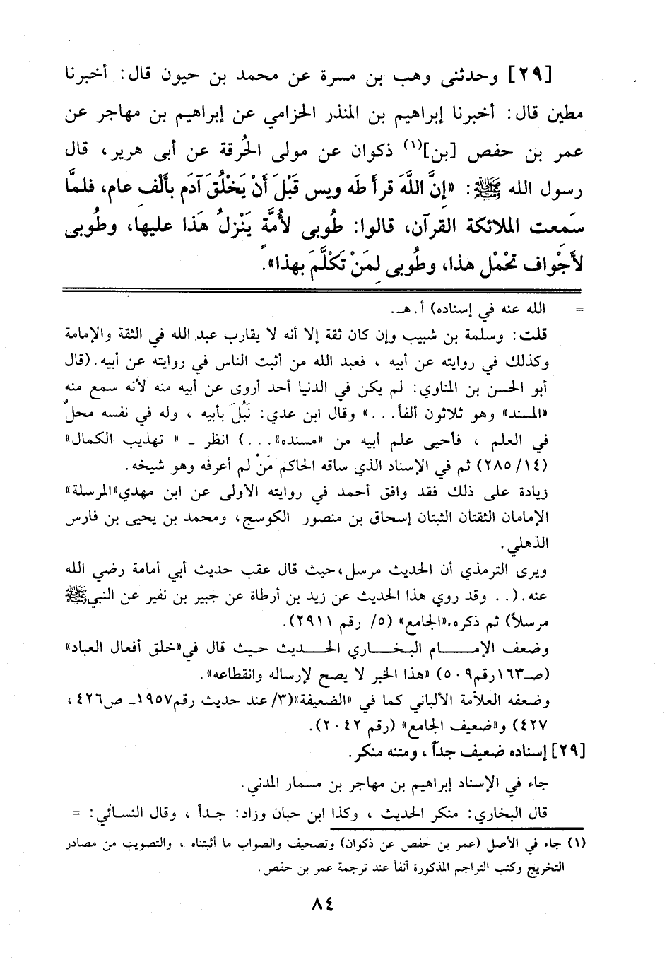 29 - وَحَدَّثَنِي وَهْبُ بْنُ مَسَرَّةَ عَنْ مُحَمَّدِ بْنِ حَيُّونَ قَالَ: أَخْبَرَنَا مُطَيَّنُ قَالَ: أَخْبَرَنَا إِبْرَاهِيمُ بْنُ اَلْمُنْذِرِ الْحِزَامِيُّ، عَنْ إِبْرَاهِيمَ بْنِ مُهَاجِرٍ، عَنْ عُمَرَ بْنِ حَفْصِ بْنِ ذَكْوَانَ، عَنْ مَوْلَى اَلْحُرَقَةِ، عَنْ أَبِي هُرَيْرَةَ قَالَ رَسُولُ اَللَّهِ صَلَّى اَللَّهُ عَلَيْهِ وَسَلَّمَ: إِنَّ اَللَّهَ قَرَأَ طَه وَيس قَبْلَ أَنْ يَخْلُقَ آدَمَ بِأَلْفِ عَامٍ، فَلَمَّا سَمِعَتْ اَلْمَلَائِكَةُ اَلْقُرْآنَ، قَالُوا: طُوبَى لِأُمَّةٍ يَنْزِلُ هَذَا عَلَيْهَا، وَطُوبَى لِأَجْوَافٍ تَحْمِلُ هَذَا، وَطُوبَى لِمَنْ تَكَلَّمَ بِهَذَا