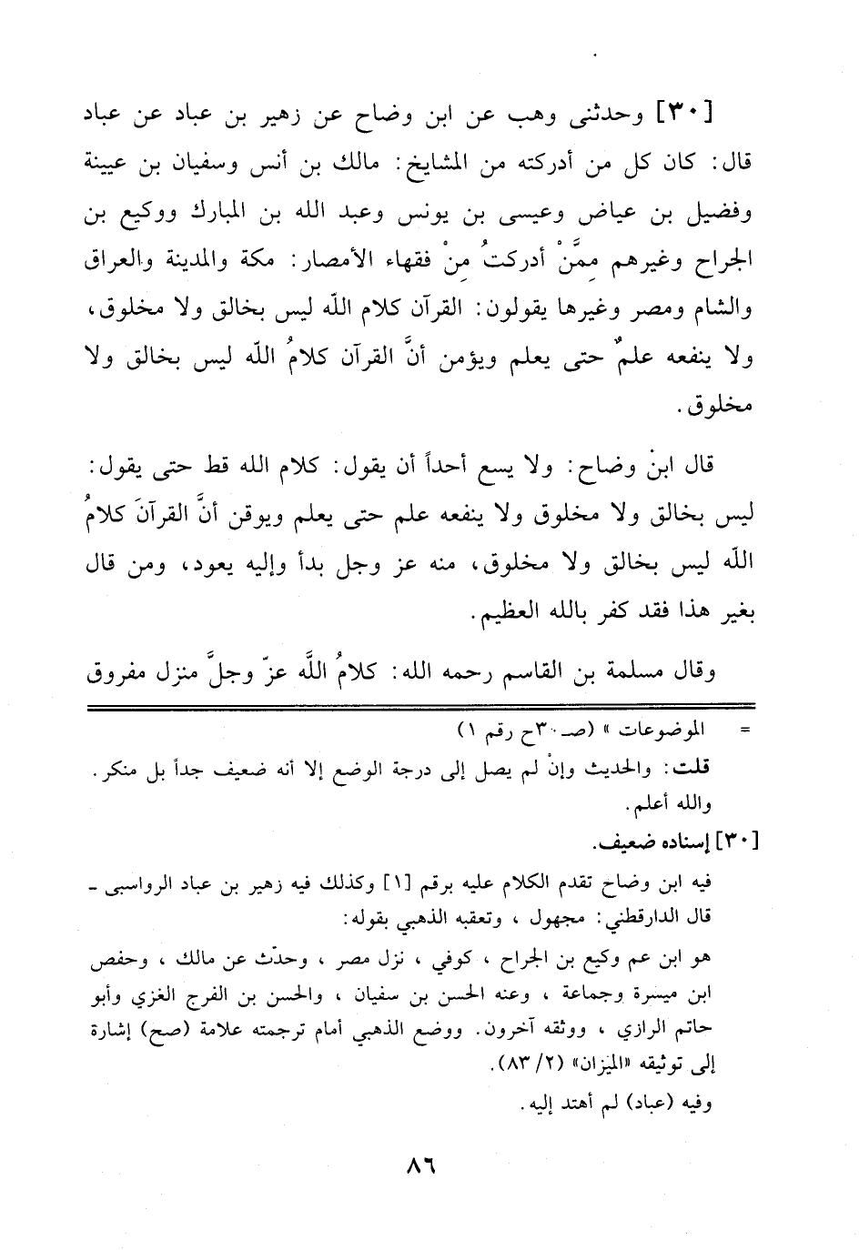 30 - وَحَدَّثَنِي وَهْبٌ عَنْ اِبْنِ وَضَّاحٍ، عَنْ زُهَيْرِ بْنِ عَبَّادٍ، عَنْ عَبَّادٍ قَالَ: كَانَ كُلُّ مَنْ أَدْرَكْتُهُ مِنْ اَلْمَشَايِخِ: مَالِكُ بْنُ أَنَسٍ وَسُفْيَانُ بْنُ عُيَيْنَةَ، وَفُضَيْلُ بْنُ عِيَاضٍ، وَعِيسَى بْنُ يُونُسَ، وعَبْدُ اللهِ بْنُ اَلْمُبَارَكِ، وَوَكِيعُ بْنُ اَلْجَرَّاحِ وَغَيْرُهُمْ مِمَّنْ أَدْرَكْتُ مِنْ فُقَهَاءِ اَلْأَمْصَارِ: مَكَّةَ وَالْمَدِينَةِ وَالْعِرَاقِ وَالشَّامِ وَمِصْرَ وَغَيْرِهَا يَقُولُونَ: اَلْقُرْآنُ كَلَامُ اَللَّهِ لَيْسَ بِخَالِقٍ وَلَا مَخْلُوقٍ، وَلَا يَنْفَعُهُ عِلْمٌ حَتَّى يَعْلَمَ وَيُؤْمِنَ أَنَّ اَلْقُرْآنَ كَلَامُ اَللَّهِ لَيْسَ بِخَالِقٍ وَلَا مَخْلُوقٍ.