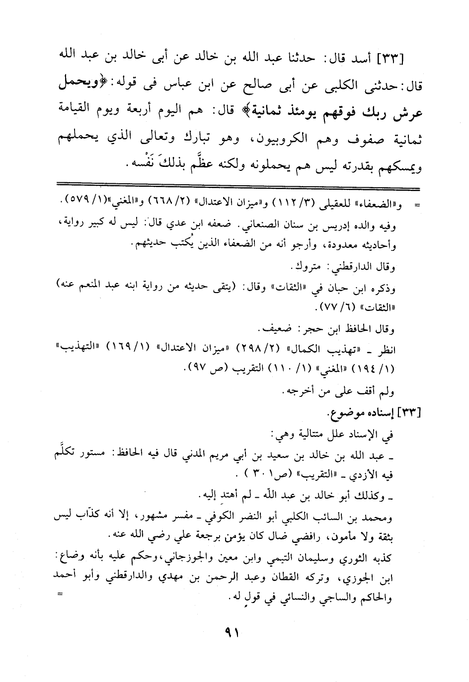 33 - أَسَدٌ قَالَ: حَدَّثَنَا عَبْدُ اللهِ بْنُ خَالِدٍ، عَنْ أَبِي خَالِدِ بْنِ عَبْدِ اللهِ قَالَ: حَدَّثَنِي اَلْكَلْبِيُّ عَنْ أَبِي صَالِحٍ، عَنْ اِبْنِ عَبَّاسٍ فِي قَوْلِهِ: وَيَحْمِلُ عَرْشَ رَبِّكَ فَوْقَهُمْ يَوْمَئِذٍ ثَمَانِيَةٌقَالَ: هُمْ اَلْيَوْمَ أَرْبَعَةٌ وَيَوْمَ اَلْقِيَامَةِ ثَمَانِيَةُ صُفُوفٍ وَهُمْ الكُرُوبِيُّون، وَهُوَ تَبَارَكَ وَتَعَالَى اَلَّذِي يَحْمِلُهُمْ وَيُمْسِكُهُمْ بِقُدْرَتِهِ لَيْسَ هُمْ يَحْمِلُونَهُ وَلَكِنَّهُ عَظَّمَ بِذَلِكَ نَفْسَهُ.