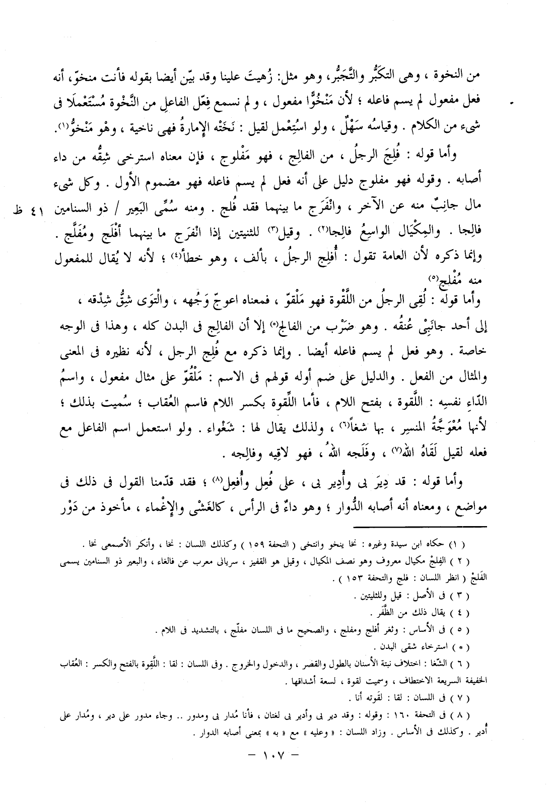 وأما قوله: لقي الرجل من اللقوة فهو ملقو، فمعناه اعوج وجهه، والتوى شق شدقه، إلى أحد جانبي عنقه. وهو ضرب من الفالج إلا أن الفالج في البدن كله، وهذا في الوجه خاصة. وهو فعل لم يسم فاعله أيضا. وأنما ذكره مع فلج الرجل، لأنه نظيره في المعنى والمثال من الفعل. والدليل على ضم أوله قولهم في الاسم: ملقو على مثال مفعول، واسم الداء نفسه: اللقوة، بفتح اللام، فأما اللقوة بكسر اللام فاسم العُقال؛ سميت بذلك؛ لأنها معوجة المنسر، بها شغاً، ولذلك يقال لها: شغواء. ولو استعمل اسم الفاعل مع فعله لقيل لقاه الله، وفلجه الله، فهو لاقيه وفالجه.