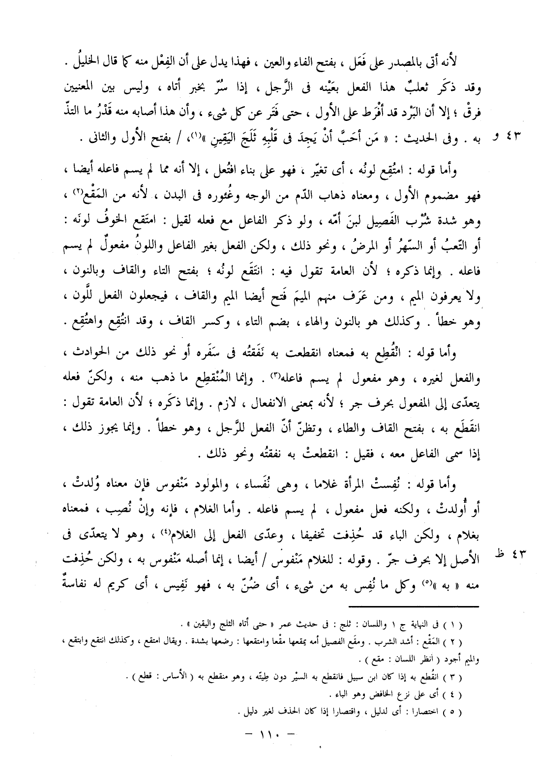 لأنه أتى بالمصدر على فعل، بفتح الفاء والعين، فهذا يدل على أن الفعل منه كما قال الخليل. وقد ذكر ثعلب هذا الفعل بعينه في الرجل، إذا سر بخبر أتاه، وليس بين المعنيين فرق؛ إلا أن البرد قد أفرط على الأول، حتى فتر عن كل شيء، وأن هذا أصابه منه قدر ما التذ به. وفي الحديث: "من أحب أن يجد في قلبه ثلج اليقين"،/ بفتح الأول والثاني.