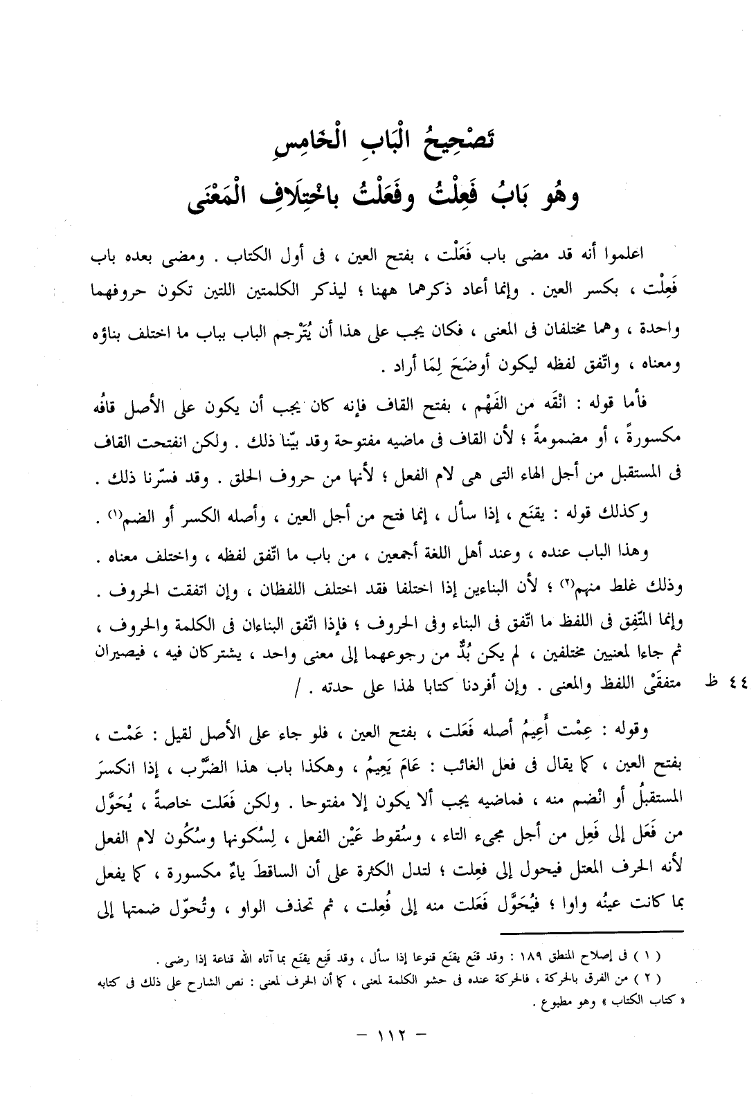 اعلموا أنه قد مضى باب فَعَلْت، بفتح العين، في أول الكتاب. ومضى بعده باب فَعِلْت، بكسر العين. وإنما أعاد ذكرهما ههنا؛ ليذكر الكلمتين اللتين تكون حروفهما واحدة، وهما مختلفان في المعنى، فكان يجب على هذا أن يترجم الباب بباب ما اختلف بناؤه ومعناه، واتفق لفظه ليكون أوضح لما أراد.