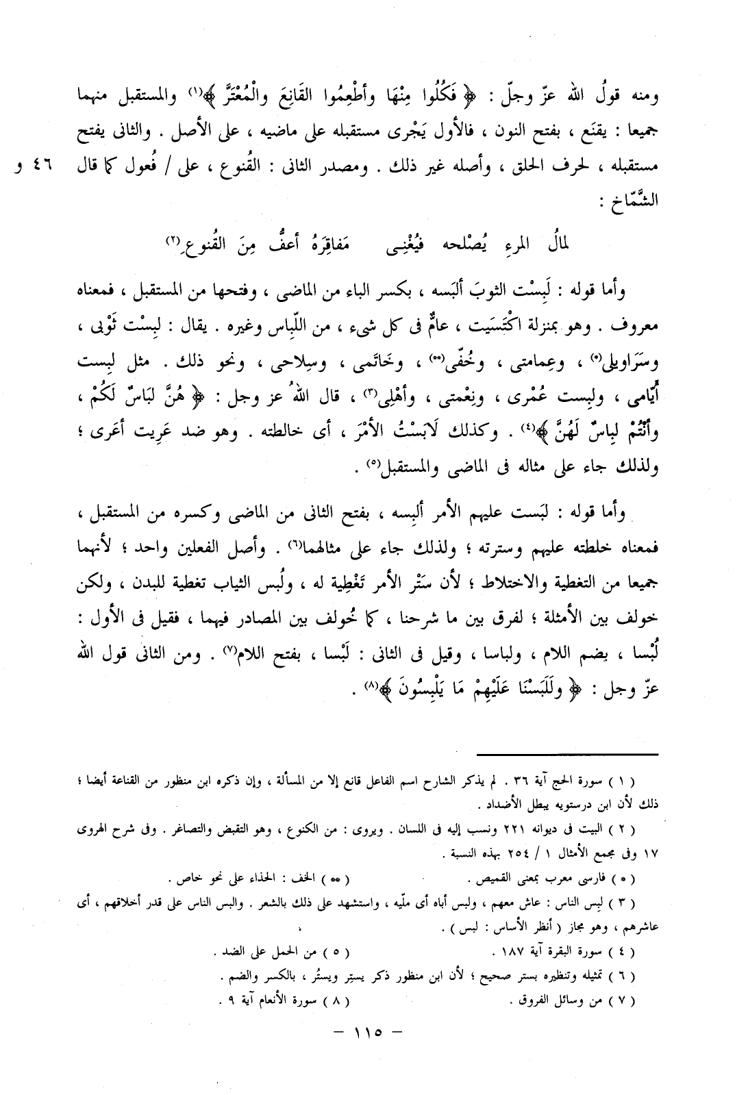 ومنه قول الله عز وجل: (فَكُلُوا مِنْهَا وَأَطْعِمُوا القَانِعَ وَالْمُعْتَرَّ) والمستقبل منهما جميعاً: يقنع، بفتح النون، فالأول يجري مستقبله على ماضيه، على الأصل. والثاني يفتح مستقبله، لحرف الحلق، وأصله غير ذلك. ومصدر الثاني: القنوع، على/ فعول كما قال الشماخ: