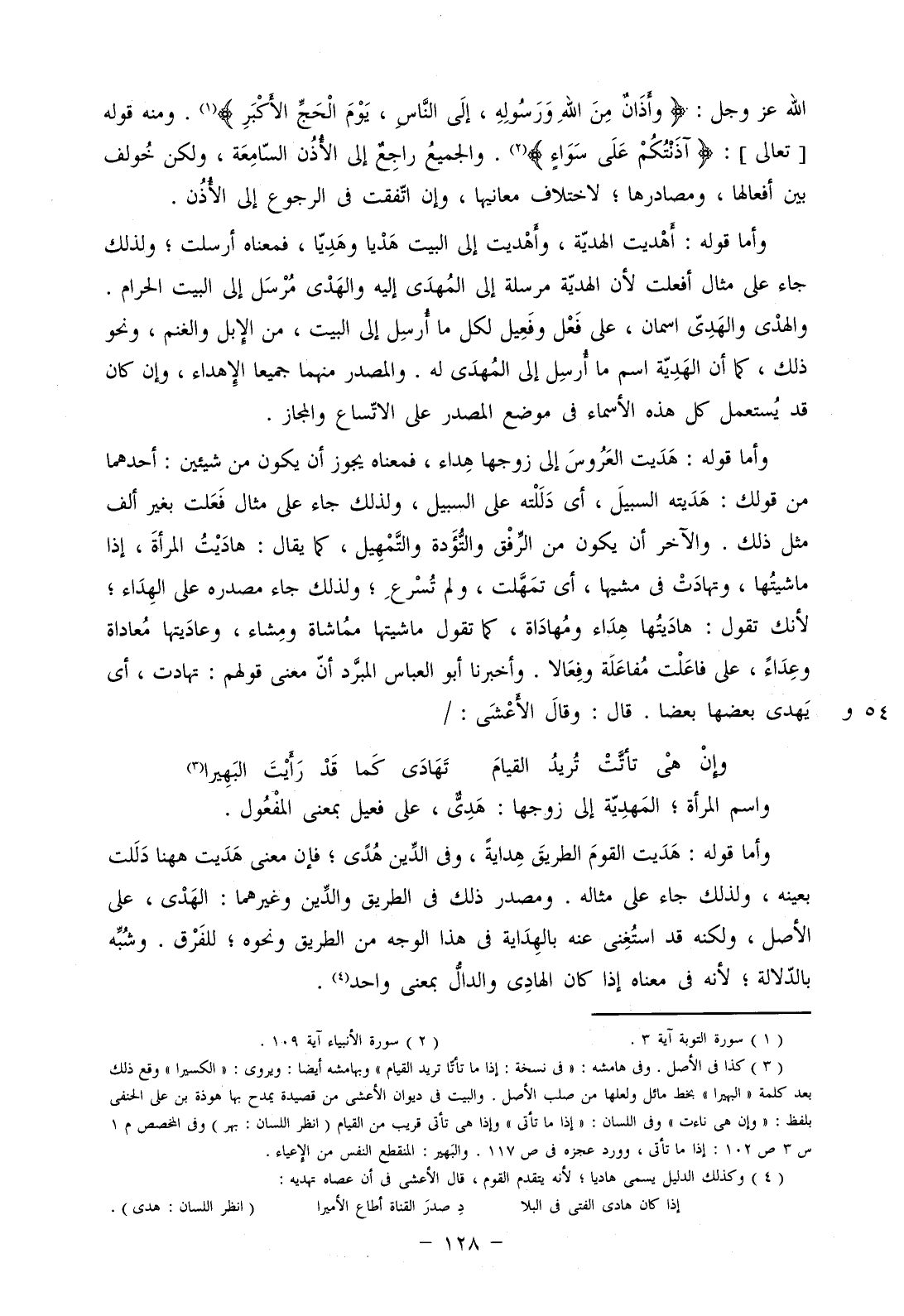 وأما قوله: هديت القوم الطريق هداية، وفي الدين هدى؛ فإن معنى هديت ههنا دللت بعينه، ولذلك جاء على مثاله. ومصدر ذلك في الطريق والدين وغيرهما: الهدي، على الأصل، ولكنه قد استغني عنه بالهداية في هذا الوجه من الطريق ونحوه؛ للفرق. وشبه بالدلالة؛ لأنه في معناه إذا كان الهادي والدال بمعنى واحد.