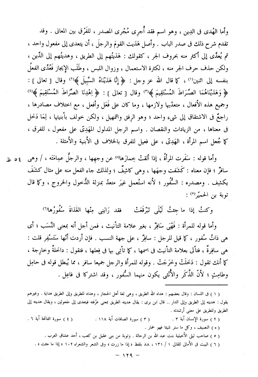 وأما الهُدى في الدين، وهو اسم فقد أجري مجرى المصدر، للفرق بين المعاني. وقد تقدم شرح ذلك في صدر الباب. وأصل هديت القوم والرجل، أن يتعدى إلى مفعول واحد، ثم يتعدى إلى أكثر منه بحروف الجر، كقولك: هديتهم إلى الطريق، وهديتهم إلى الدين، ولكن حذف حرف الجر منه، لكثرة الاستعمال، وزوال اللبس، وطلب الإيجاز فعدي الفعل بنفسه إلى اثنين، كما قال الله عز وجل: (إنَّا هَدَيْنَاهُ السَّبِيلَ) وقال [تعالى]: (وهَدَيْنَاهُمَا الصِّرَاطَ المُسْتَقِيمَ) وقال [تعالى]: (اهْدِنَا الصِّرَاطَ المُسْتَقِيمَ) وجميع هذه الأفعال، متعديها ولازمها، وما كان على فعل وأفعل، مع اختلاف مصادرها، راجع في الاشتقاق إلى شيء واحد؛ وهو الرفق والتمهيل، ولكن خولف بأبنيتها، لما دخل في معناها، من الزيادات والنقصان. واسم الرجل المدلول المهدي على مفعول، للفرق، كما جعل اسم المرأة، الهدي، على فعيل للفرق بالخلاف في الأبنية والأمثلة.